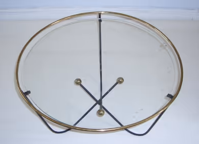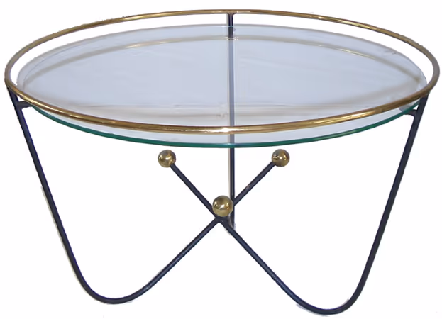 An 'Atomic' side table in black-powder coated metal and brass details with round glass top