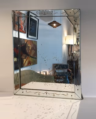 A great mirror with original foxed plate and eglomise border with elegant ribbon pattern.