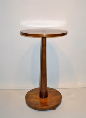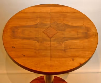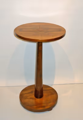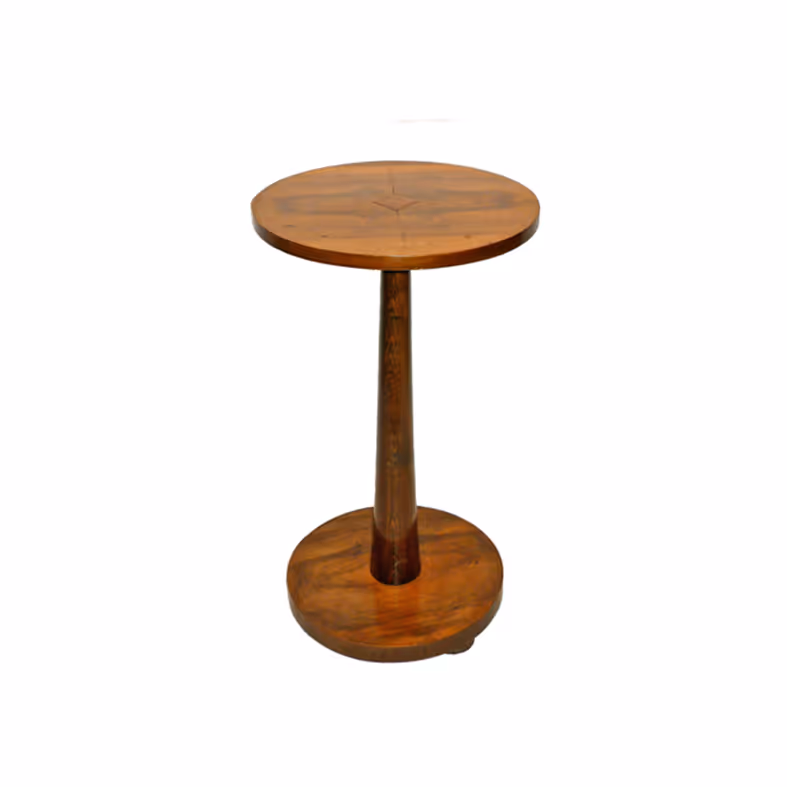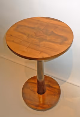 A circular side table in veneered walnut and solid oak shaft; parquetry detail on top.