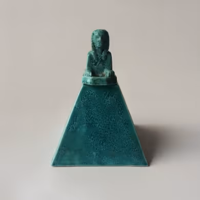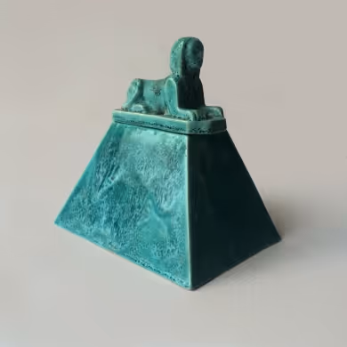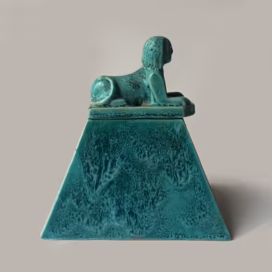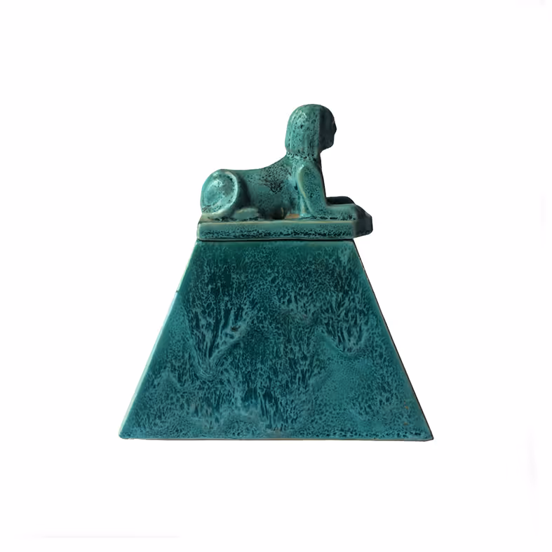 Unusual pottery incense burner sphinx detail on the lid, turquoise glaze