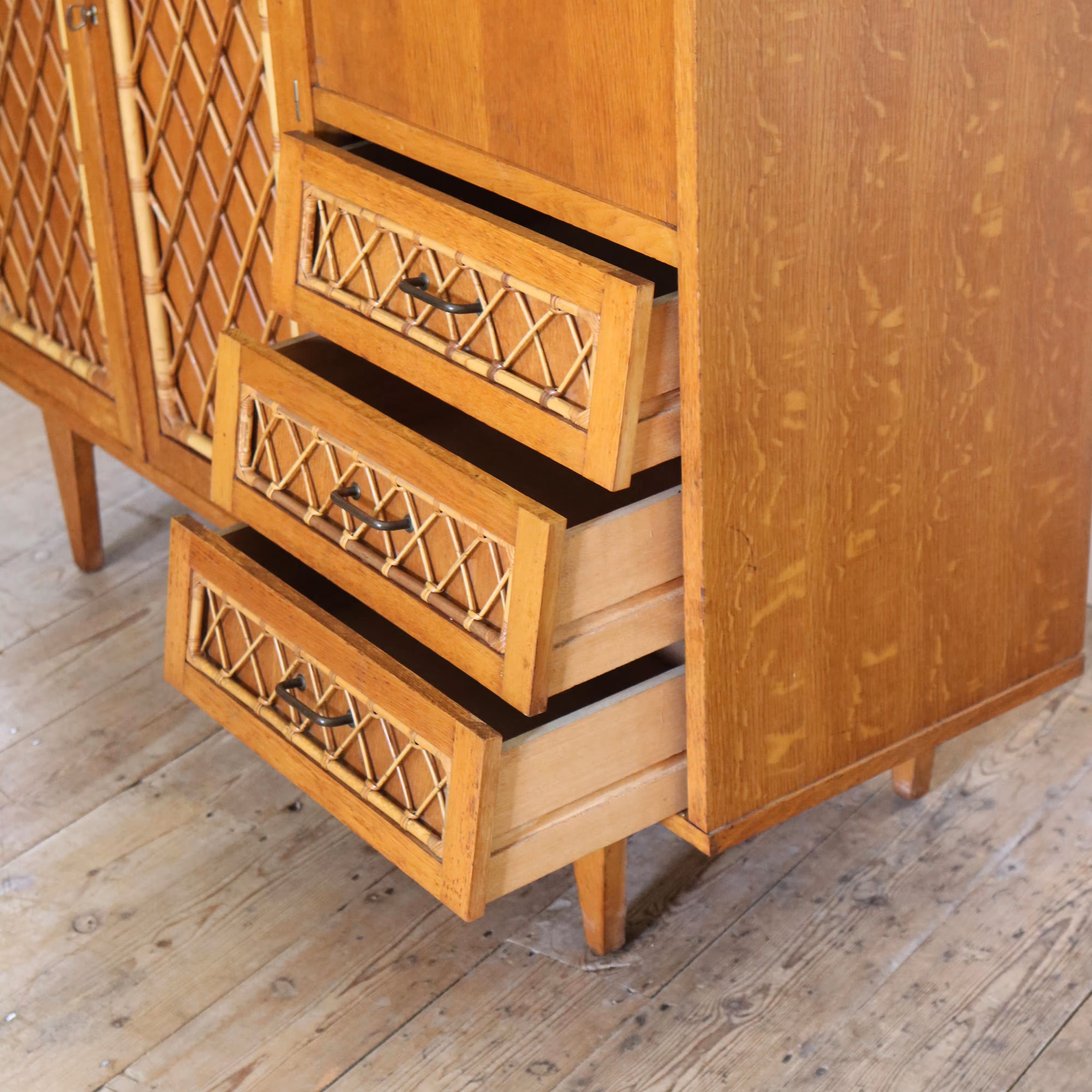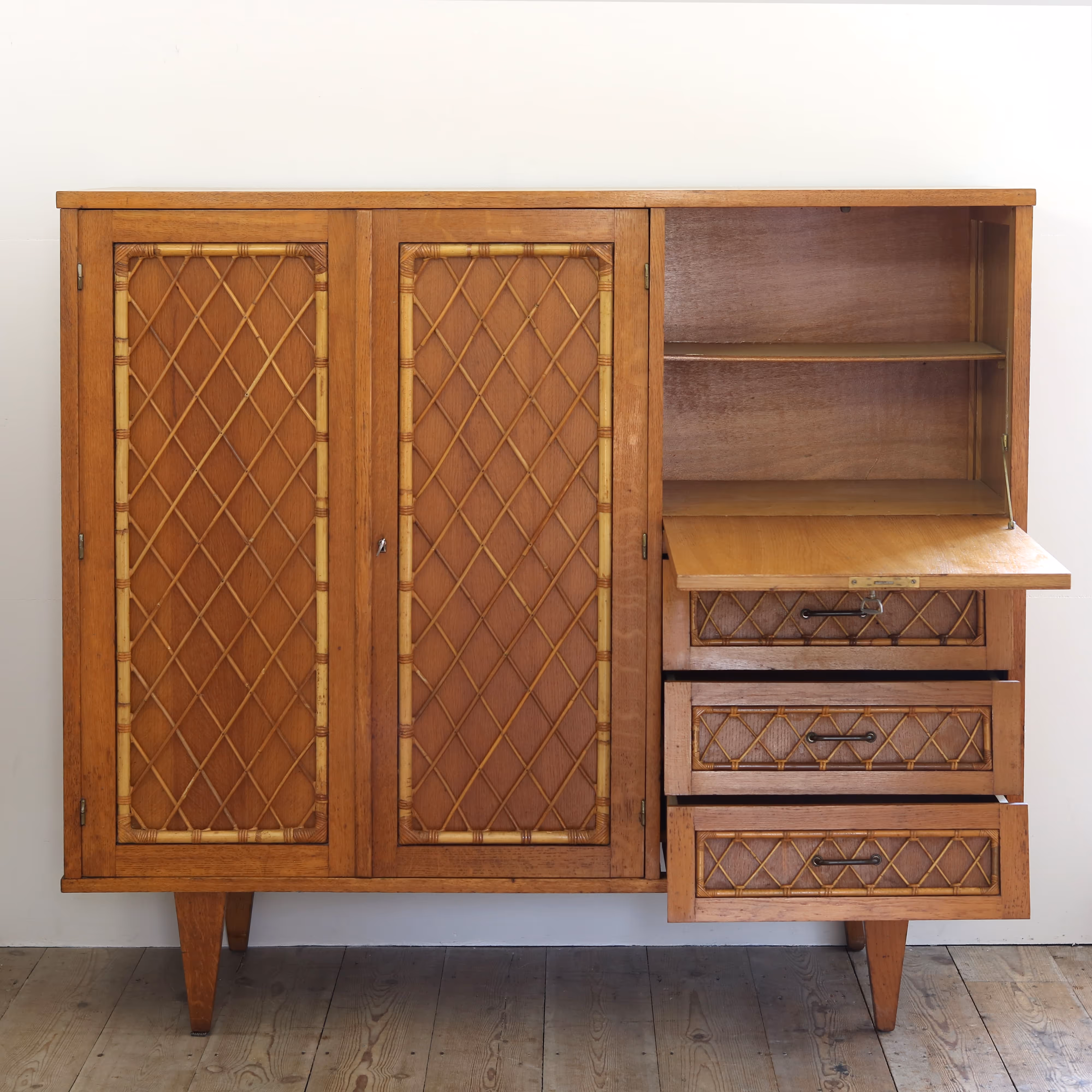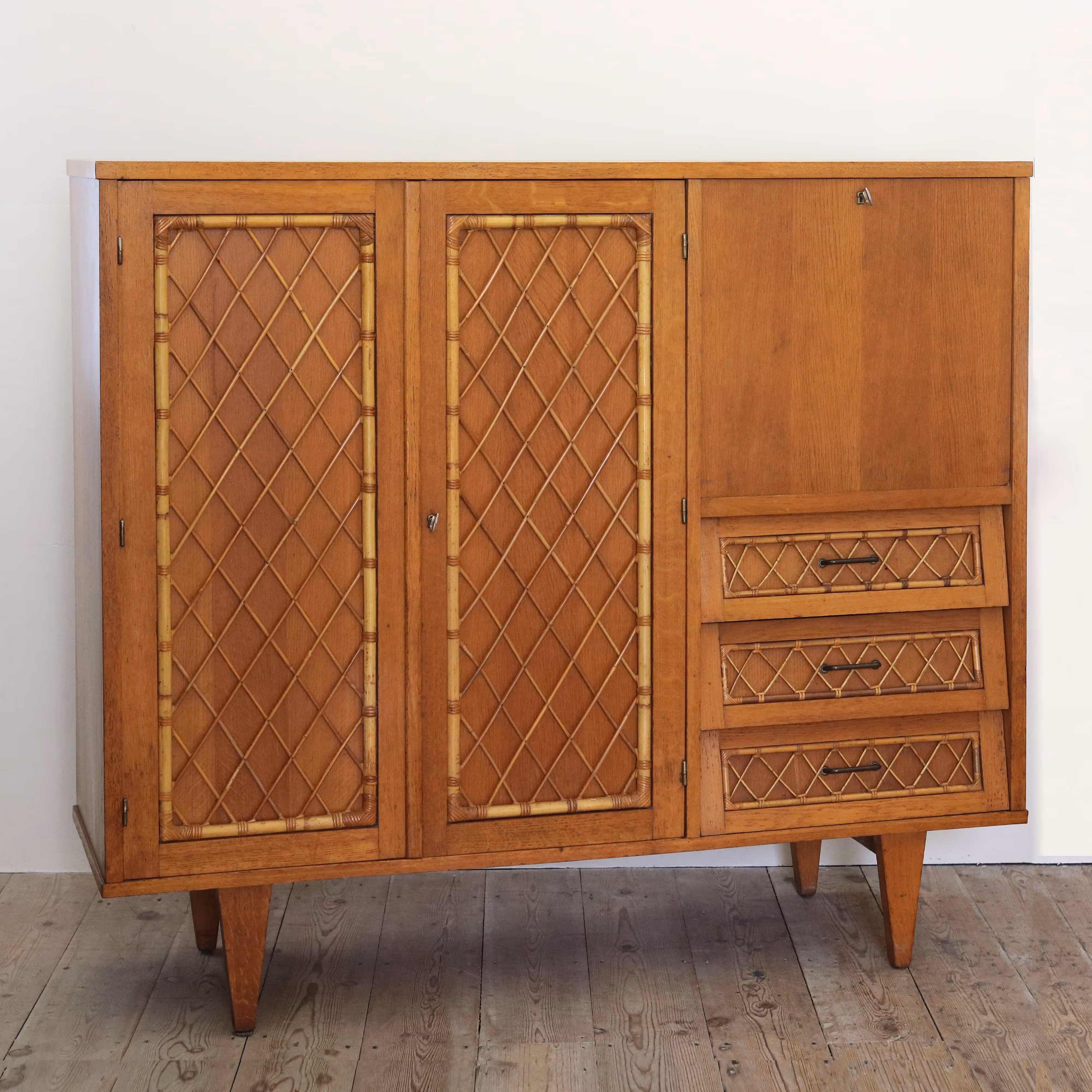 Oak cabinet with cane accents. Retractable hanging rail, ample shelving, three drawers and a fall-front compartment. Two original keys.