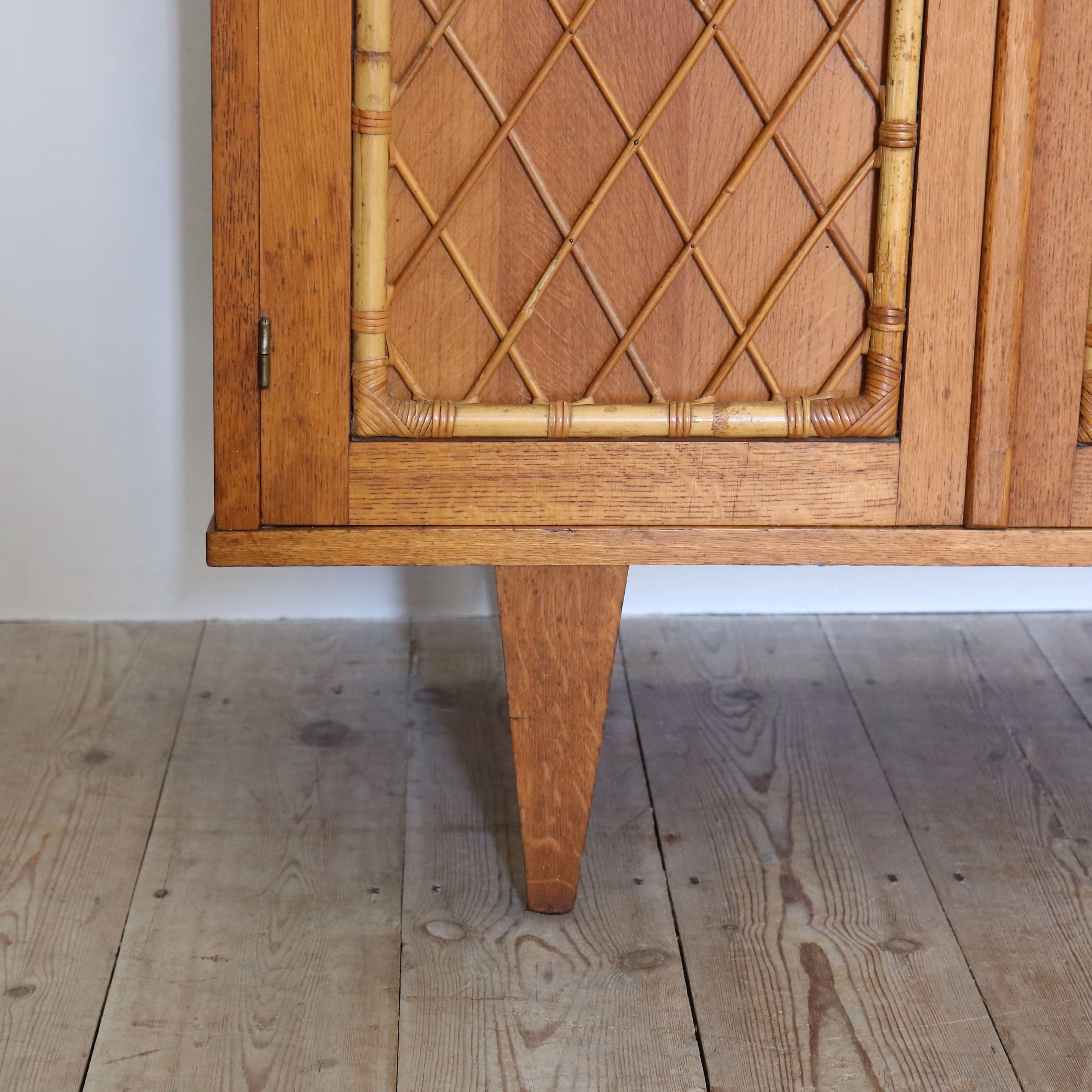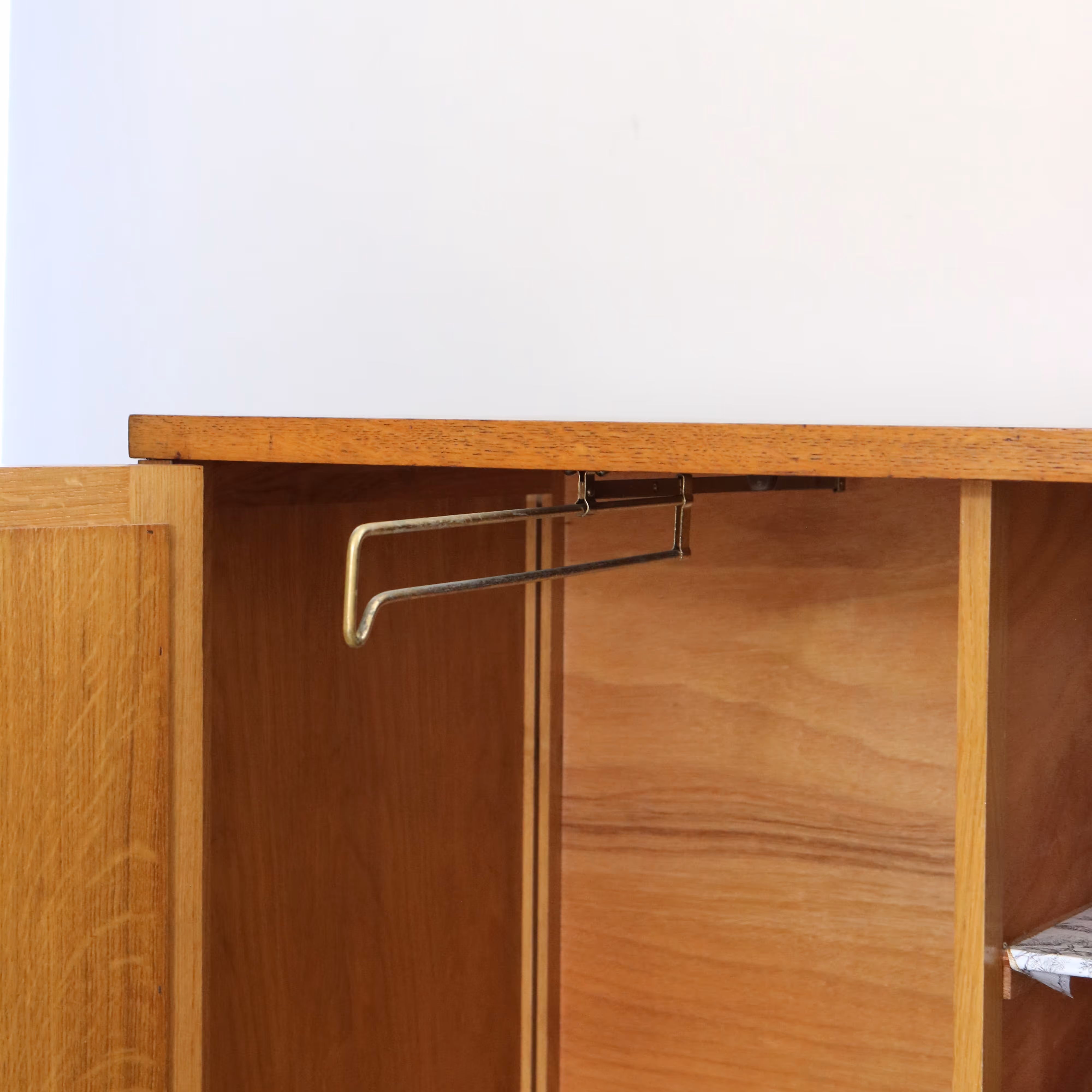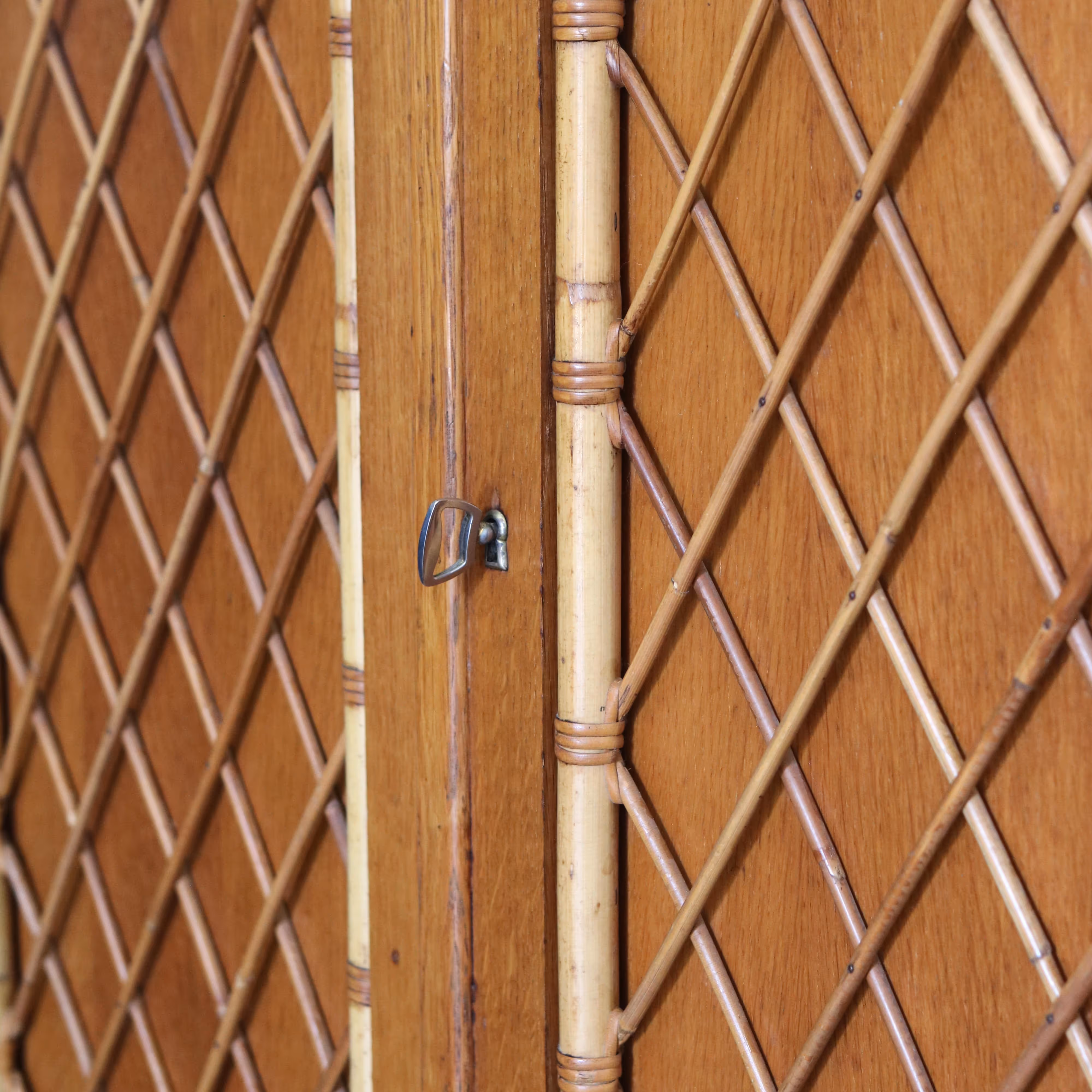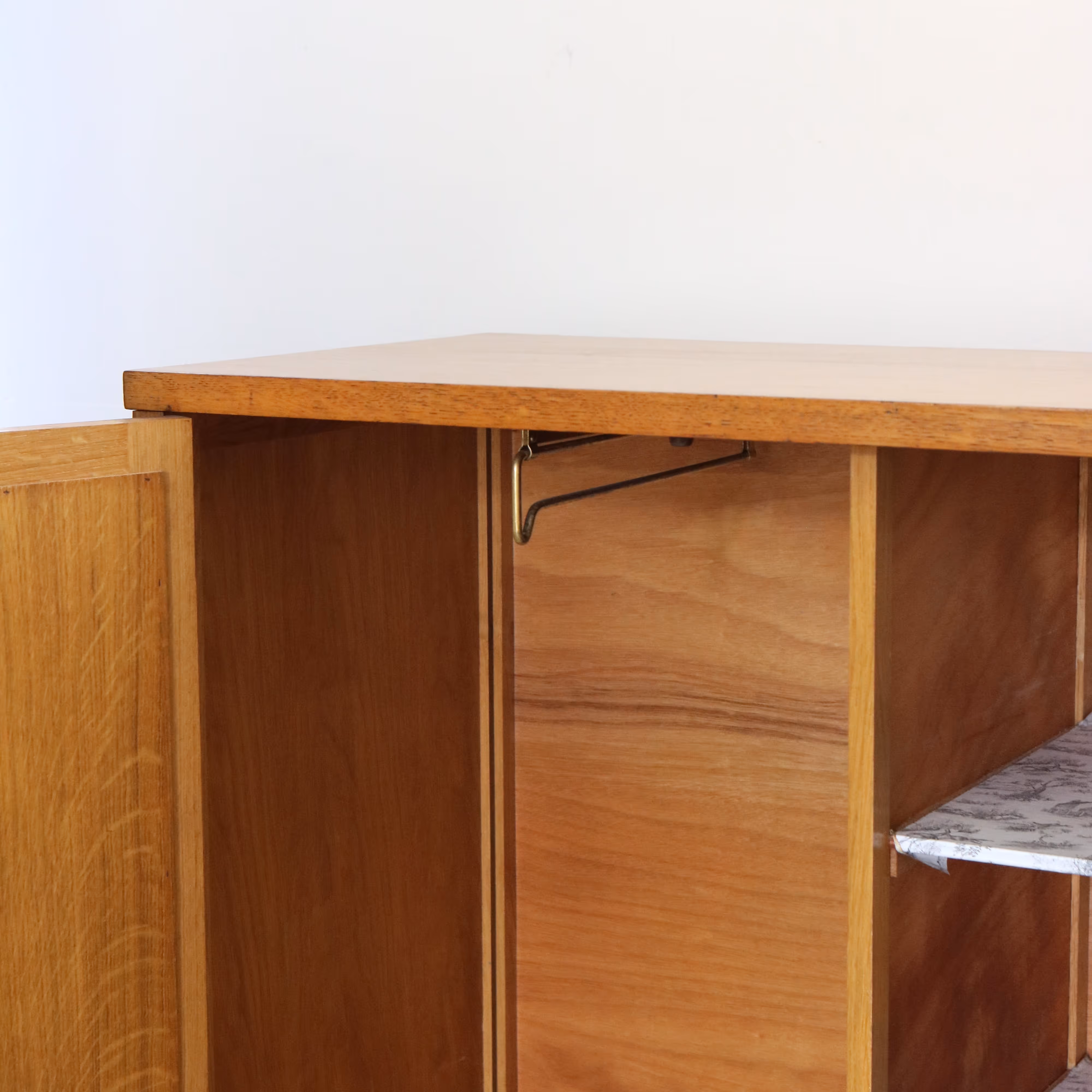 Oak cabinet with cane accents. Retractable hanging rail, ample shelving, three drawers and a fall-front compartment. Two original keys.
