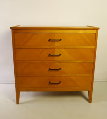 A light oak chest of drawers. Four long drawers with simple black metal handles and a herringbone veneered grain.