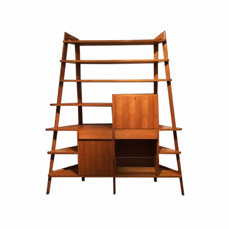 A solid & veneered oak shelving unit with fall-front cabinet, cupboard, drawers and magazine holder. This piece is likely to be a one-off commission from an architect.