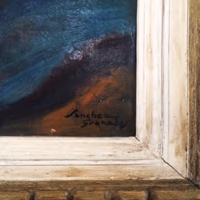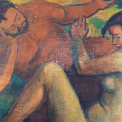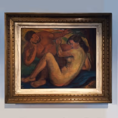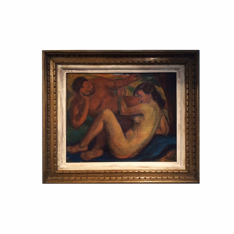 An oil painting of a man & a woman representing a faun and a nymph as per the title on the reverse: 'L'apres-midi d'un faune', based on the eponymous poem by Stephane Mallarme, which in turn inspired composer Claude Debussy and choreographer Vaslav Nijinsky. Signed Sanchez-Granados