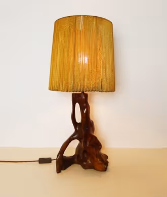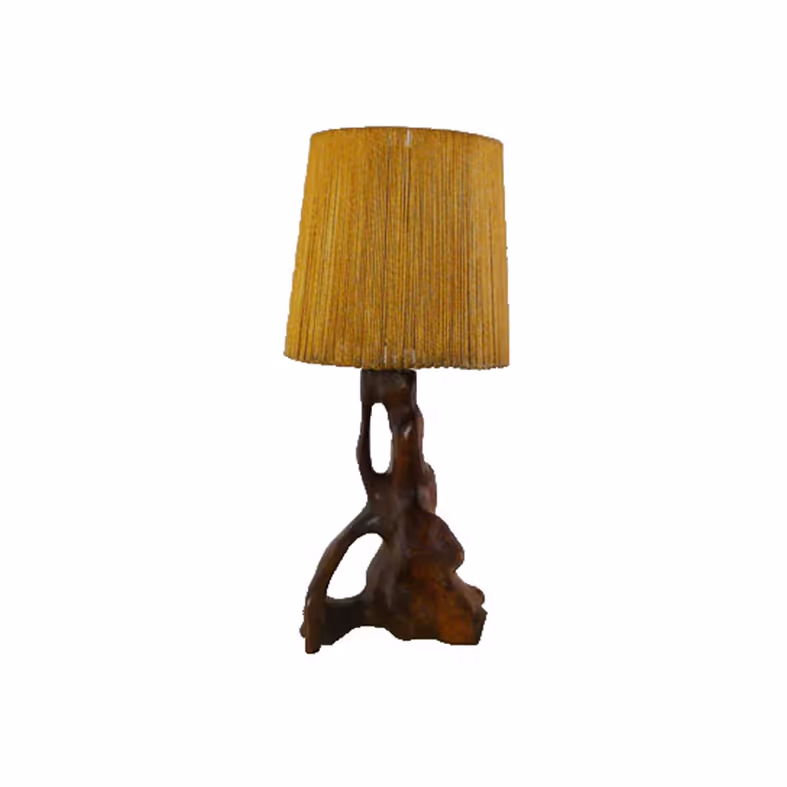 An olive wood root table lamp with original rope shade. Rewired and PAT certified