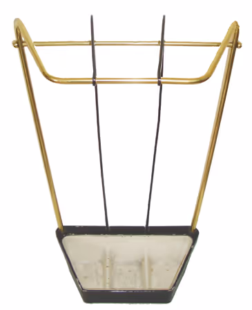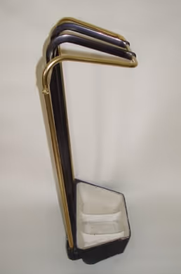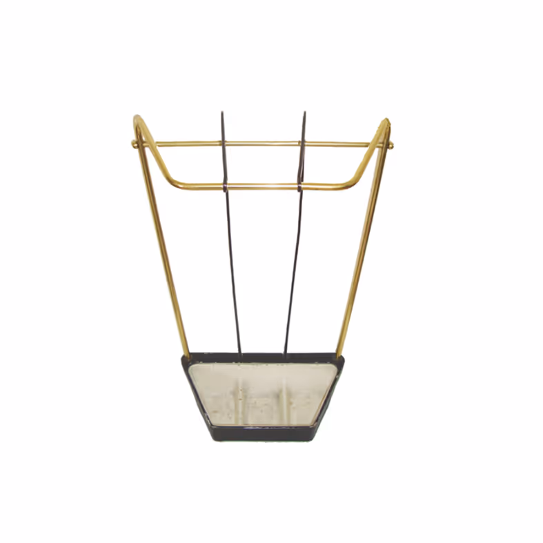 A dynamically-shaped brass & black metal umbrella holder with cast iron basis