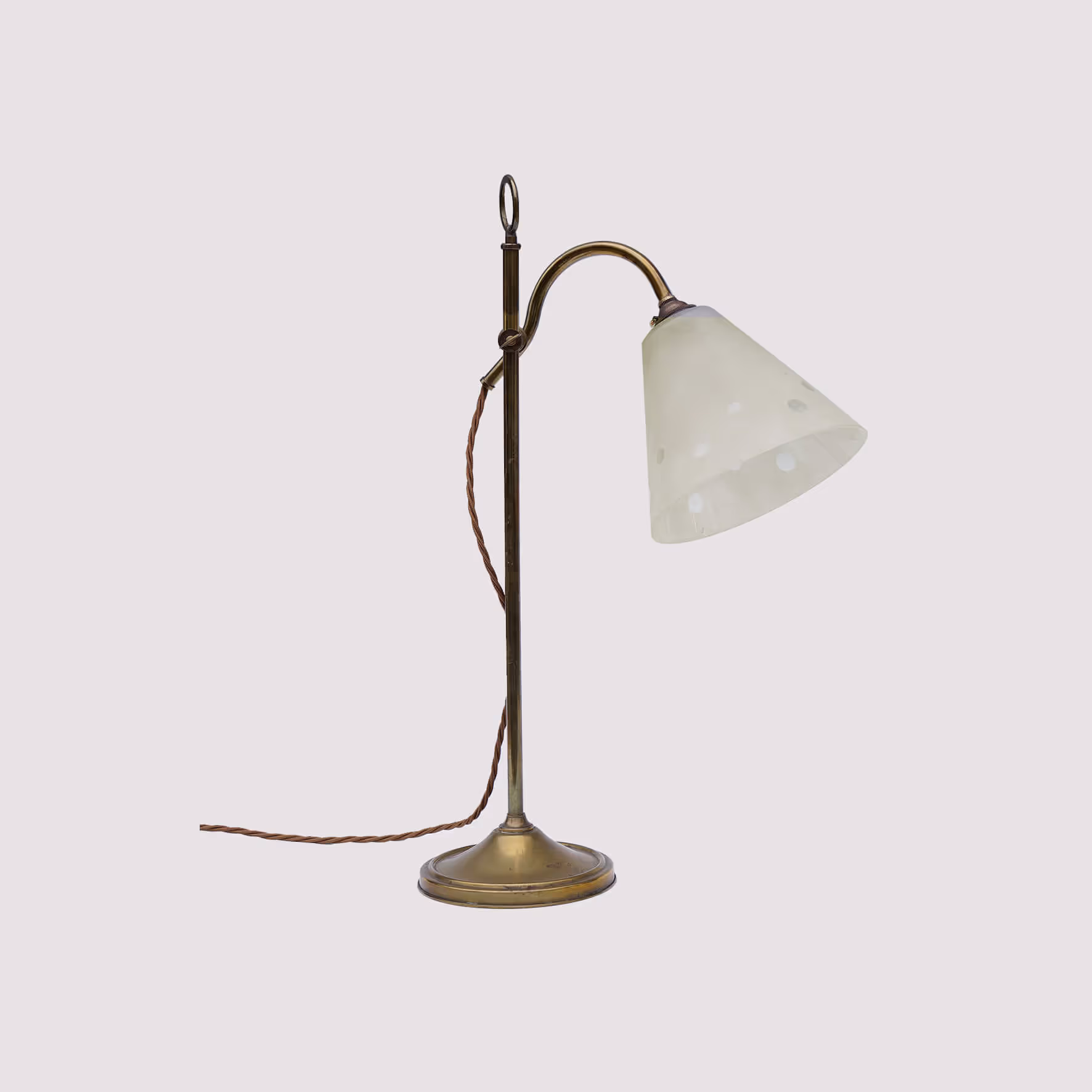 Angled brass table lamp with etched glass shade. Rewired & PAT-certified