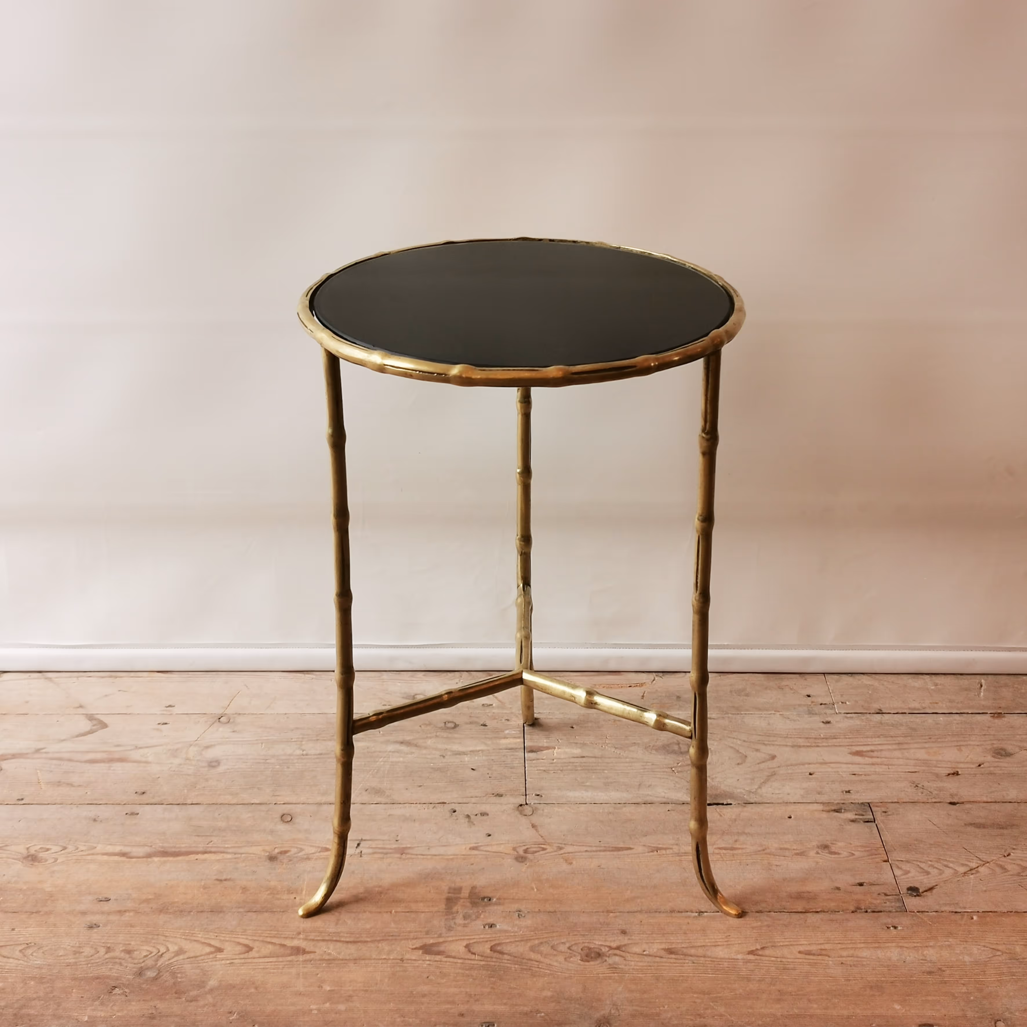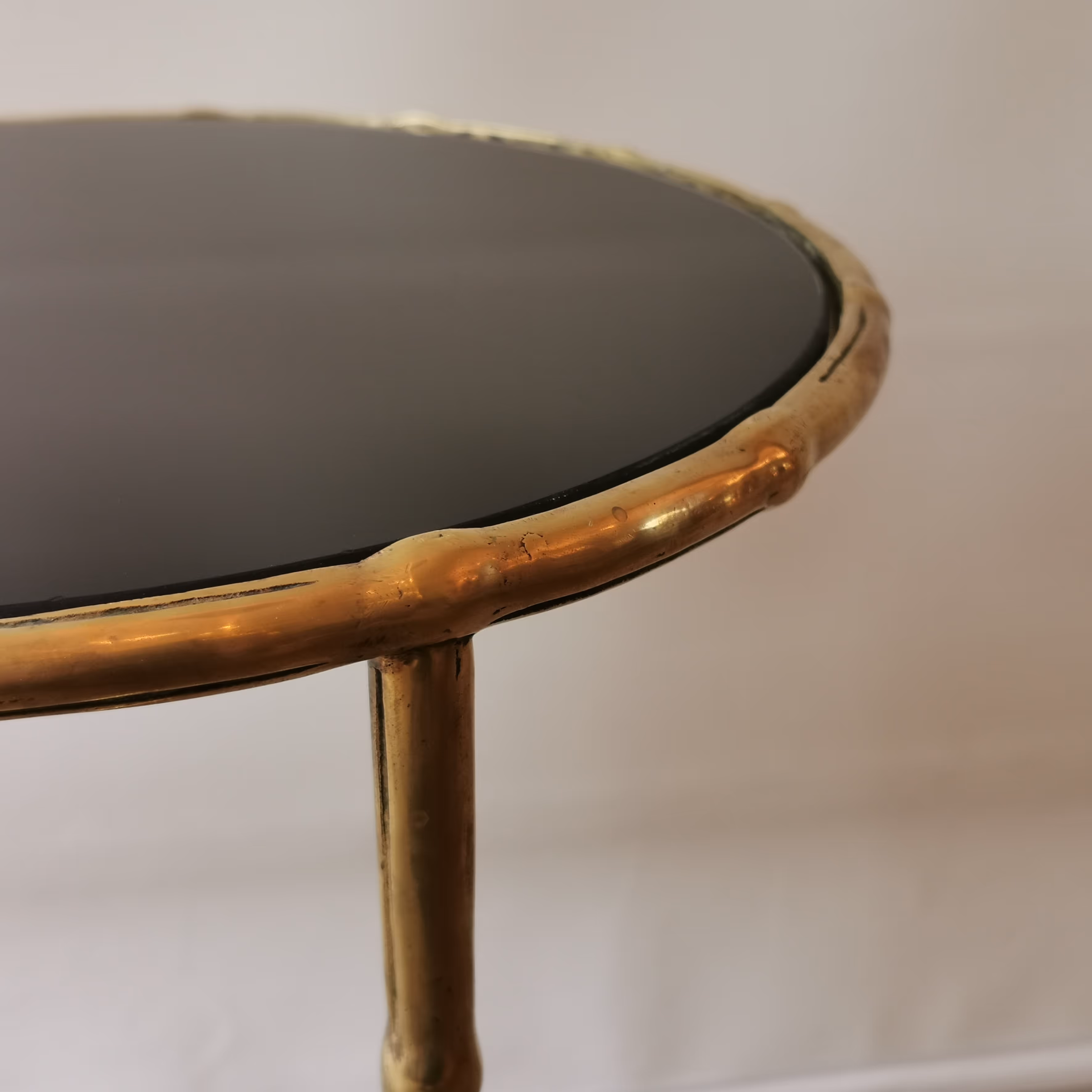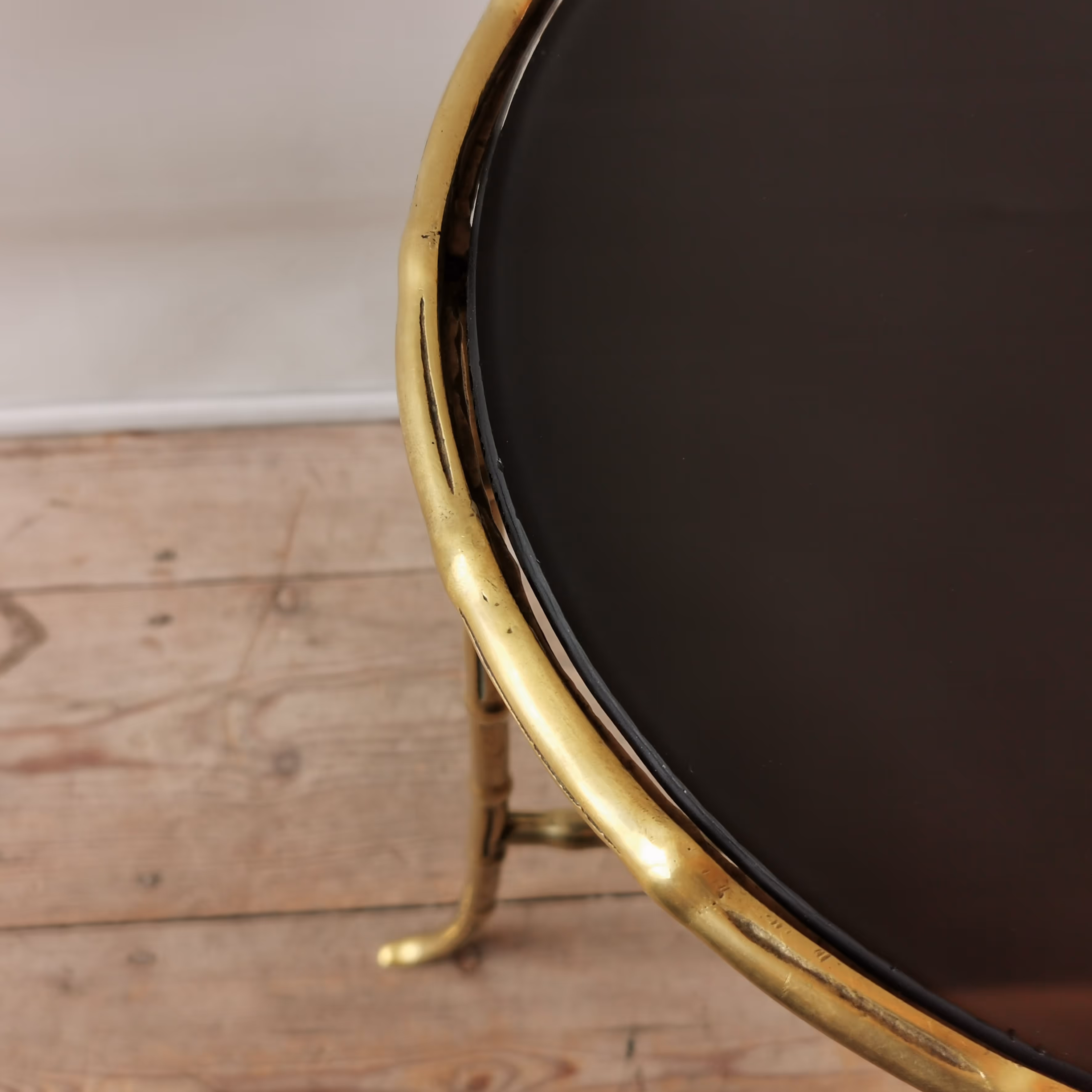 Circular faux bamboo side table, brass tripod base and new black glass top. Possibly by Maison Baguès