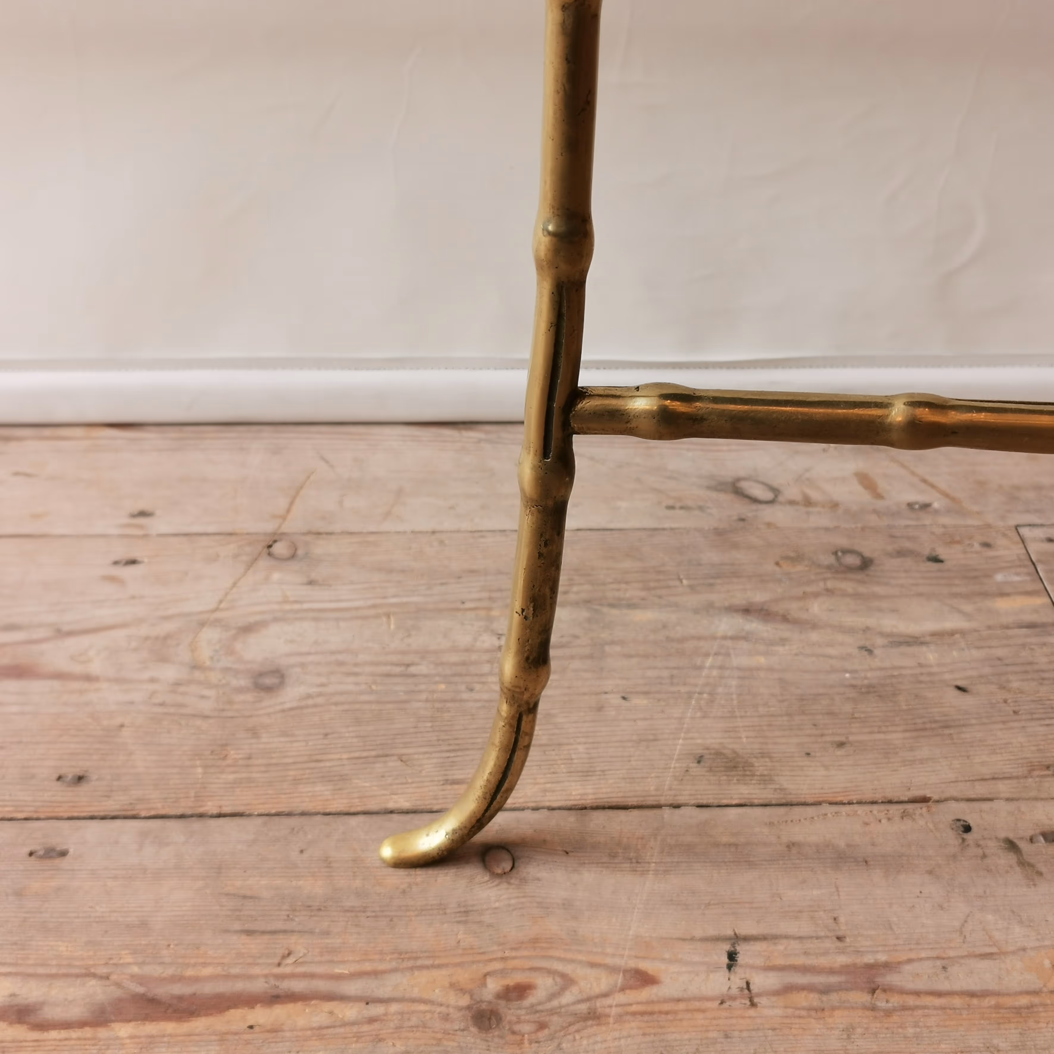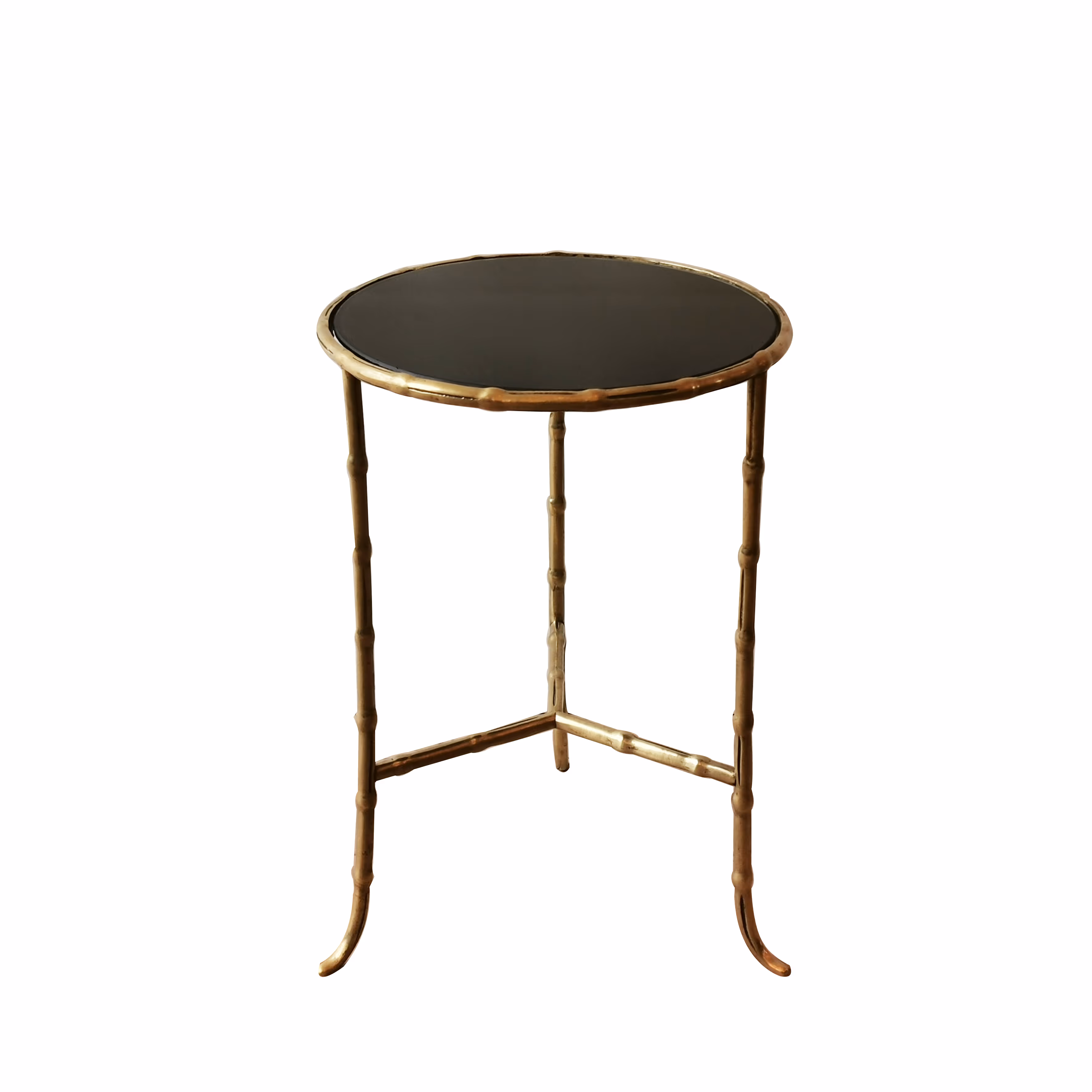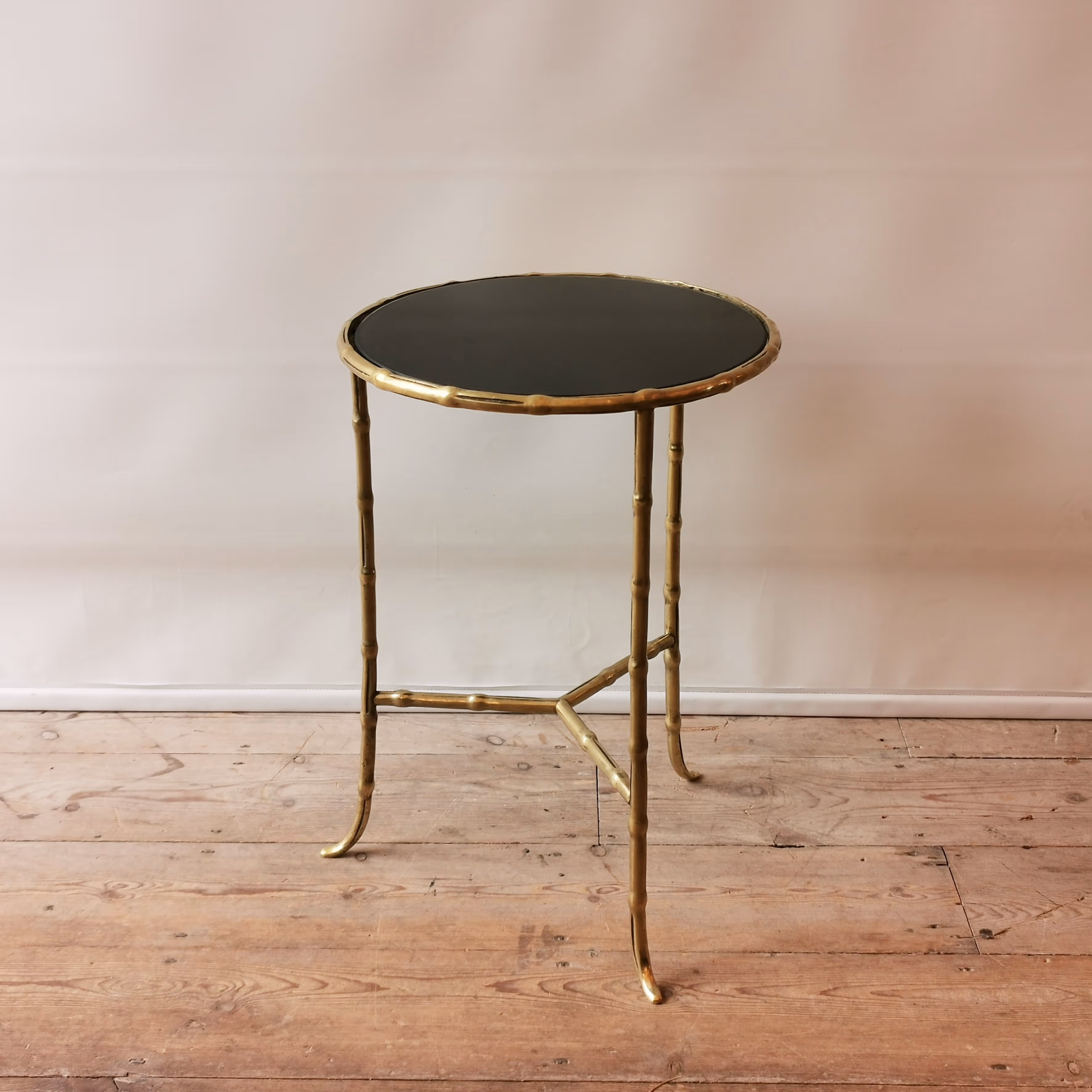 Circular faux bamboo side table, brass tripod base and new black glass top. Possibly by Maison Baguès