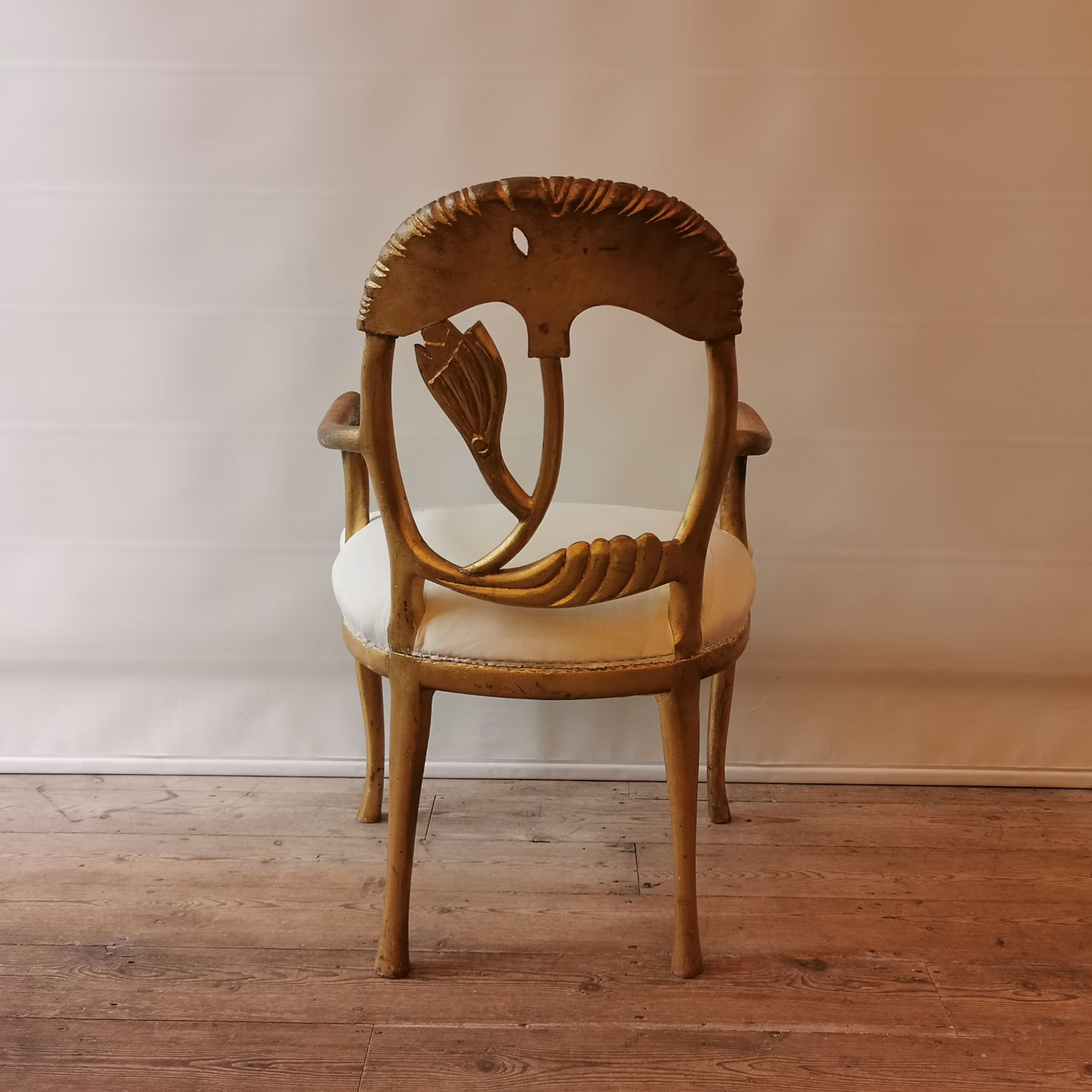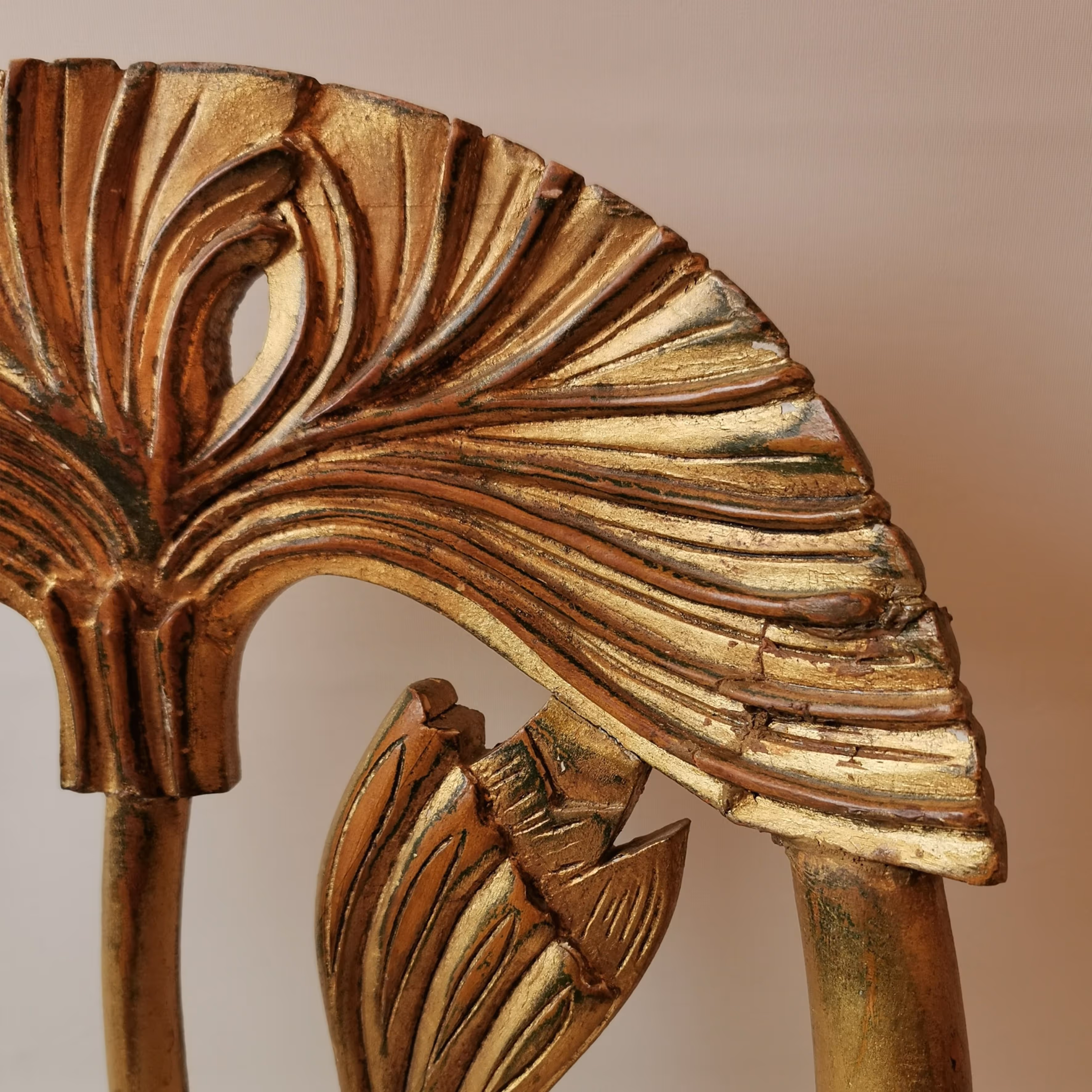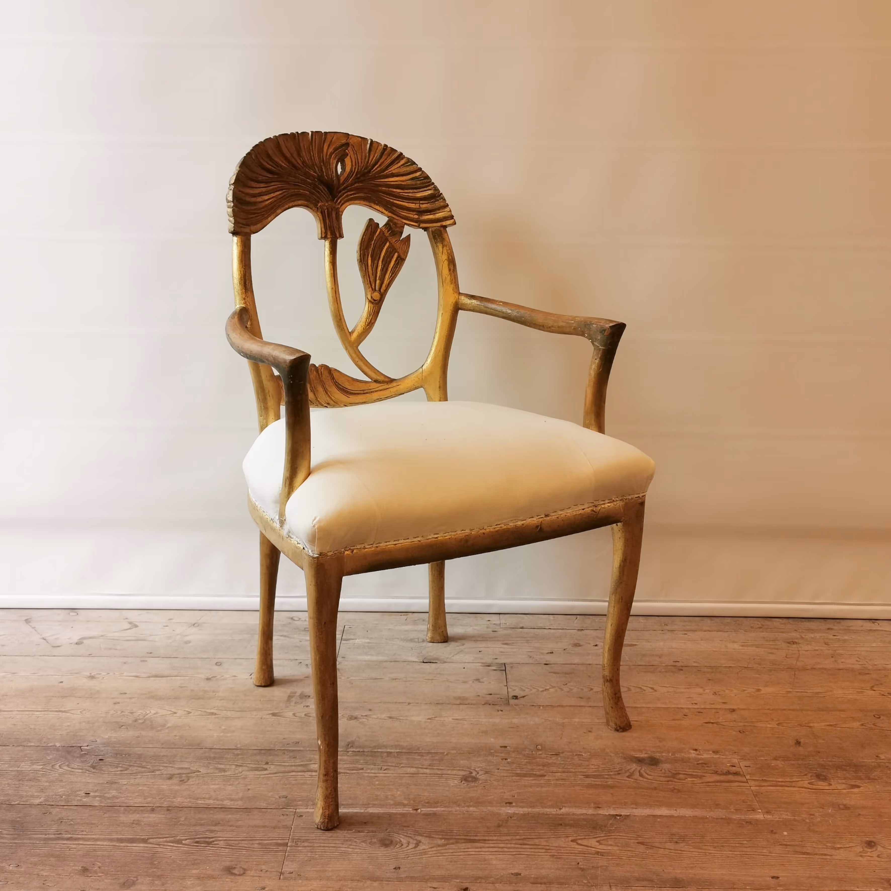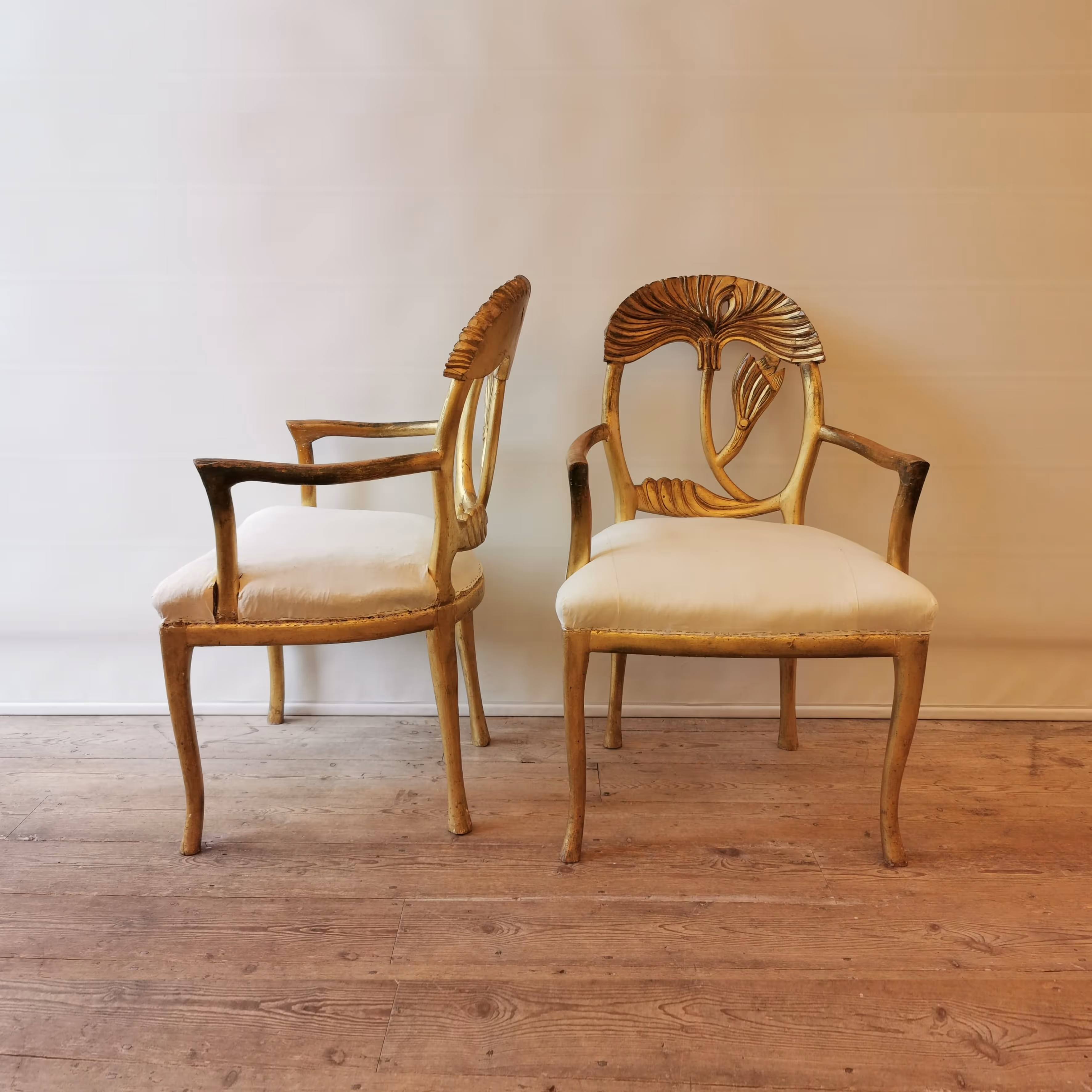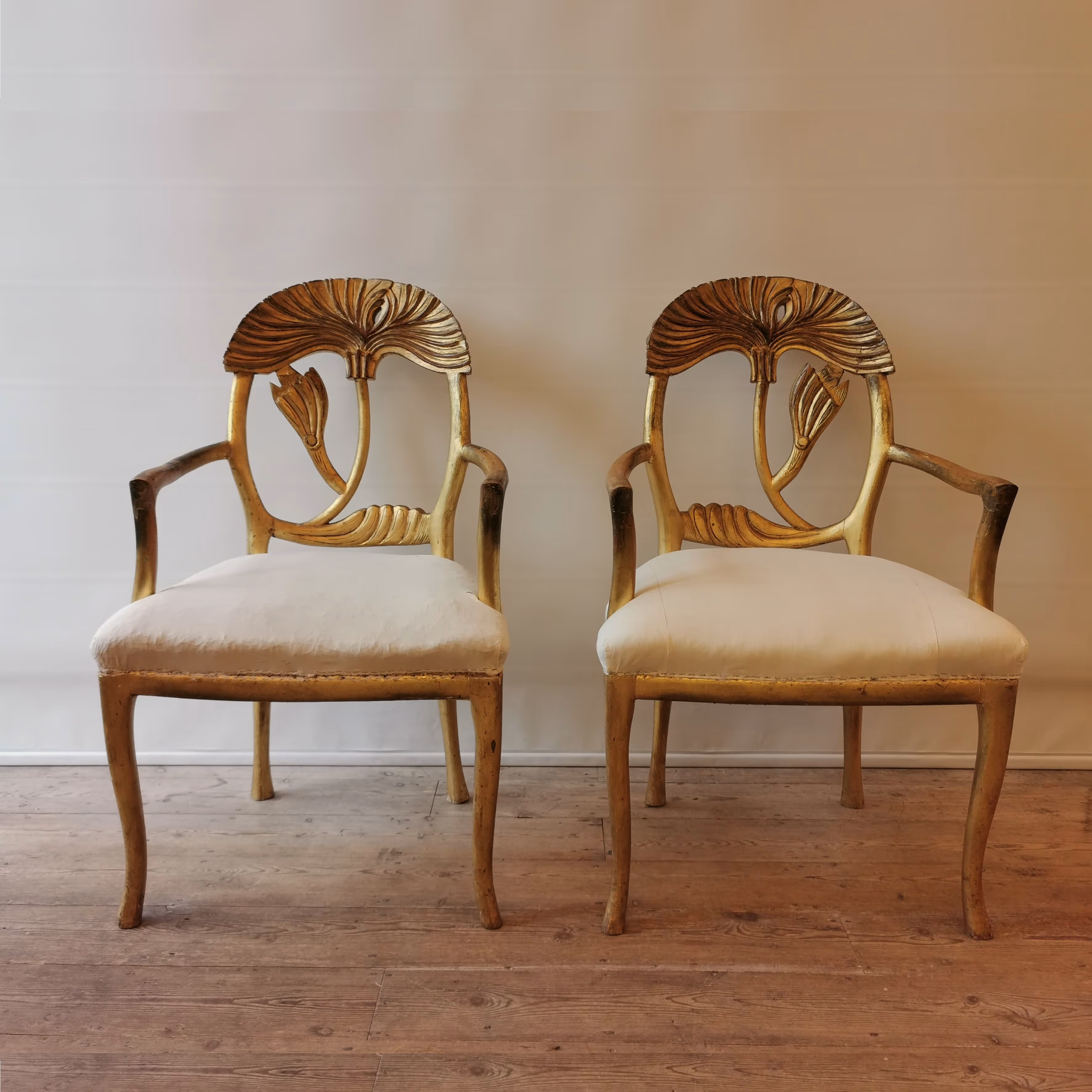 Pair of unusual, late Art Nouveau giltwood armchairs, the carved backs stylized as papyrus leaves.