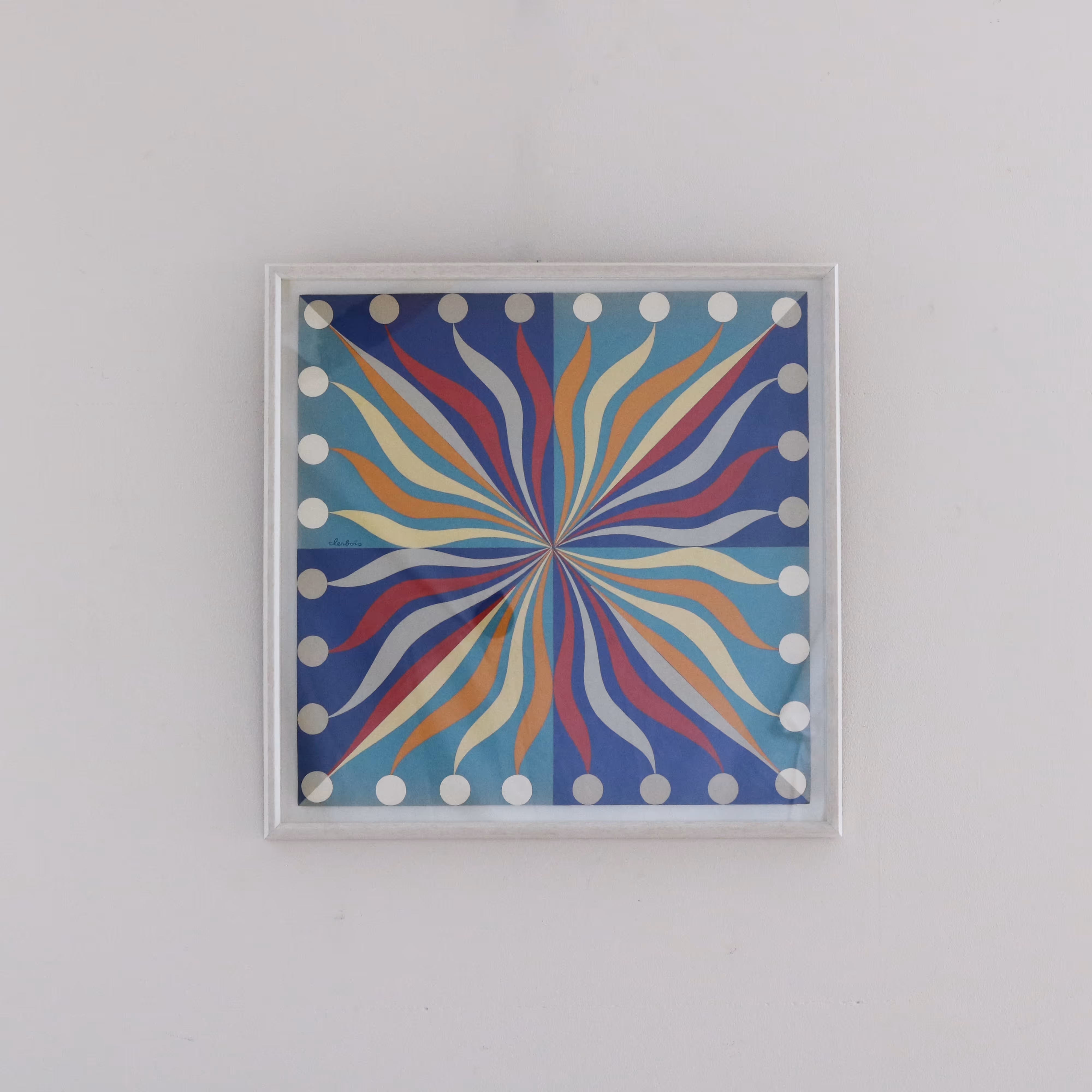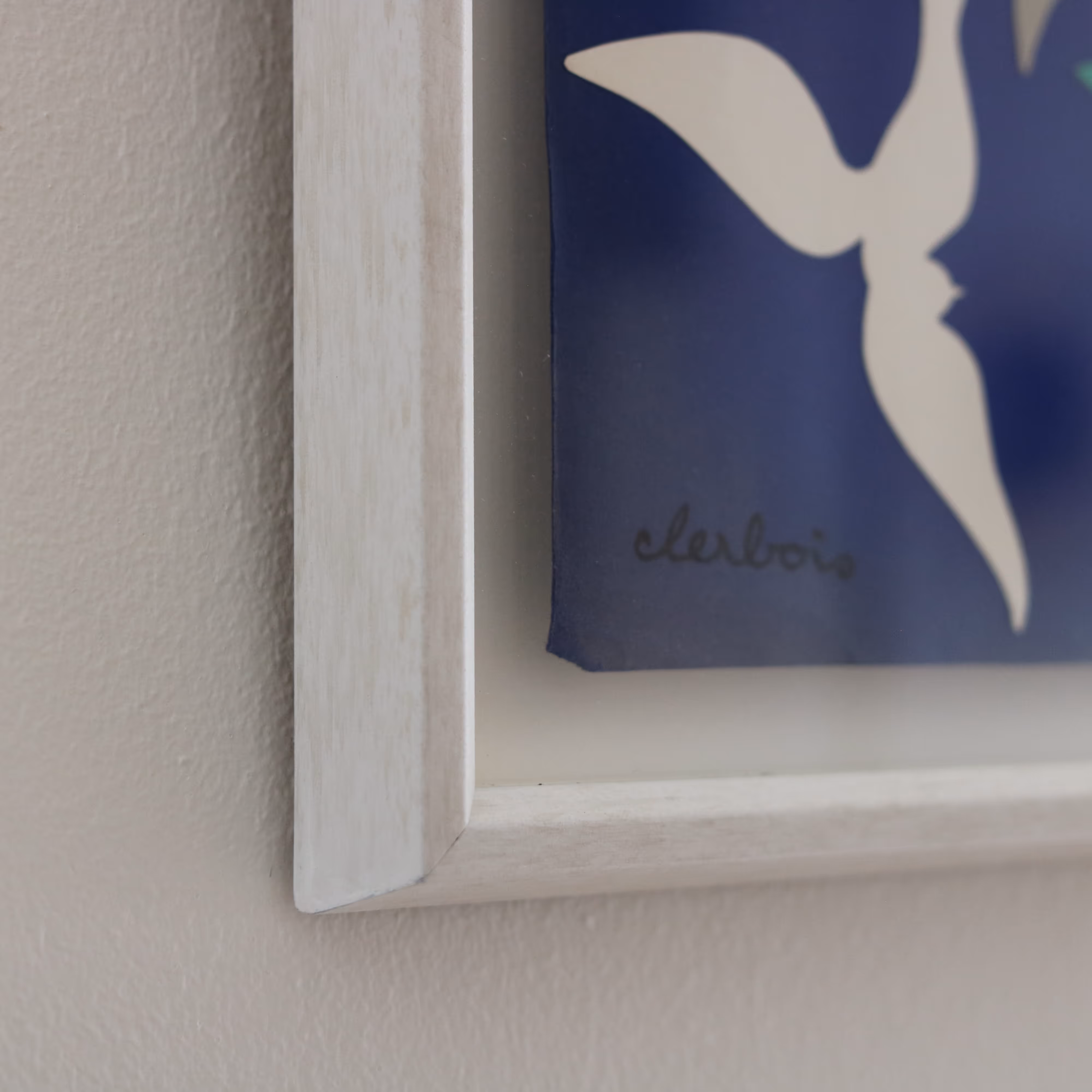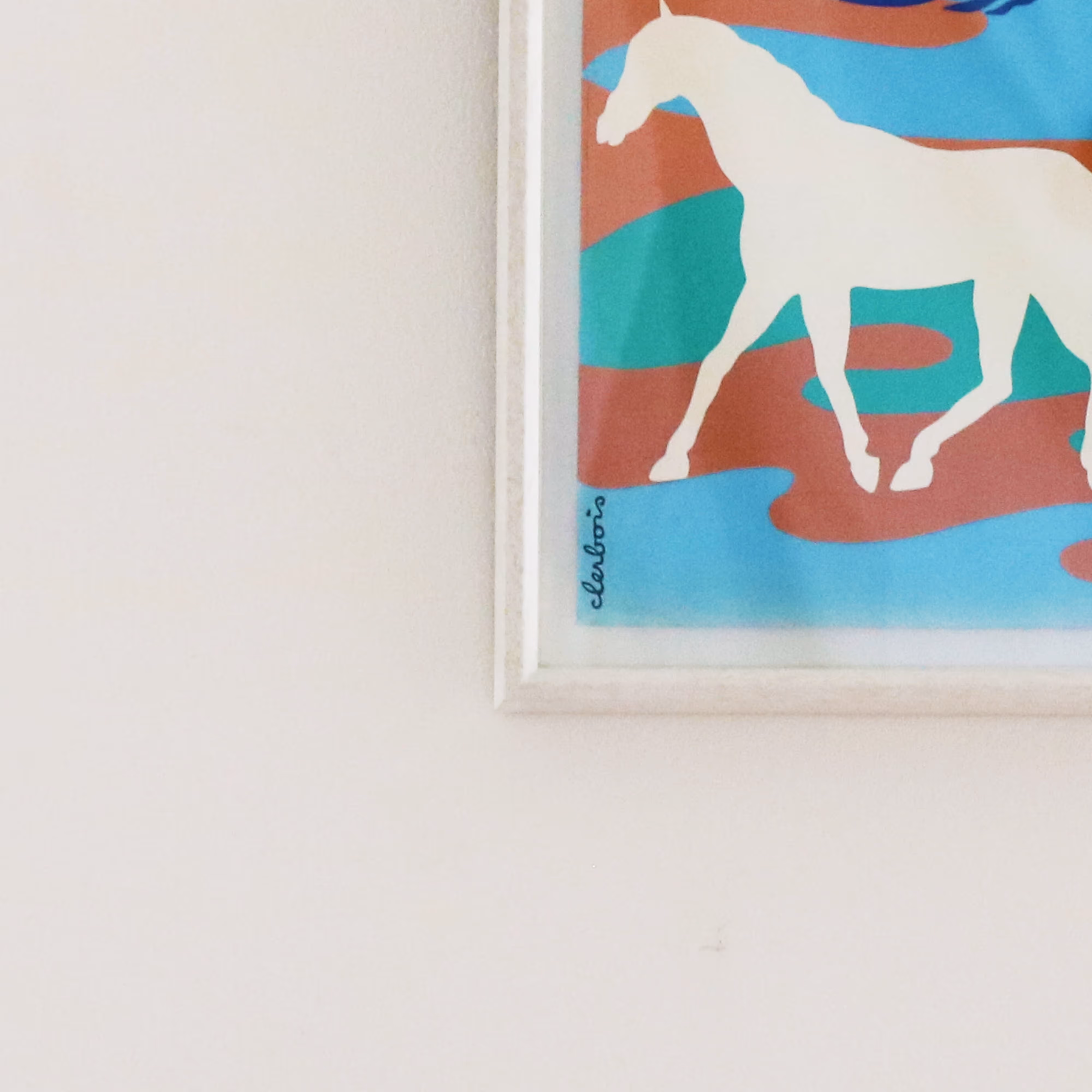 Set of three brightly coloured collages by illustrator Clerbois, respectively representing horse, birds and the sun.