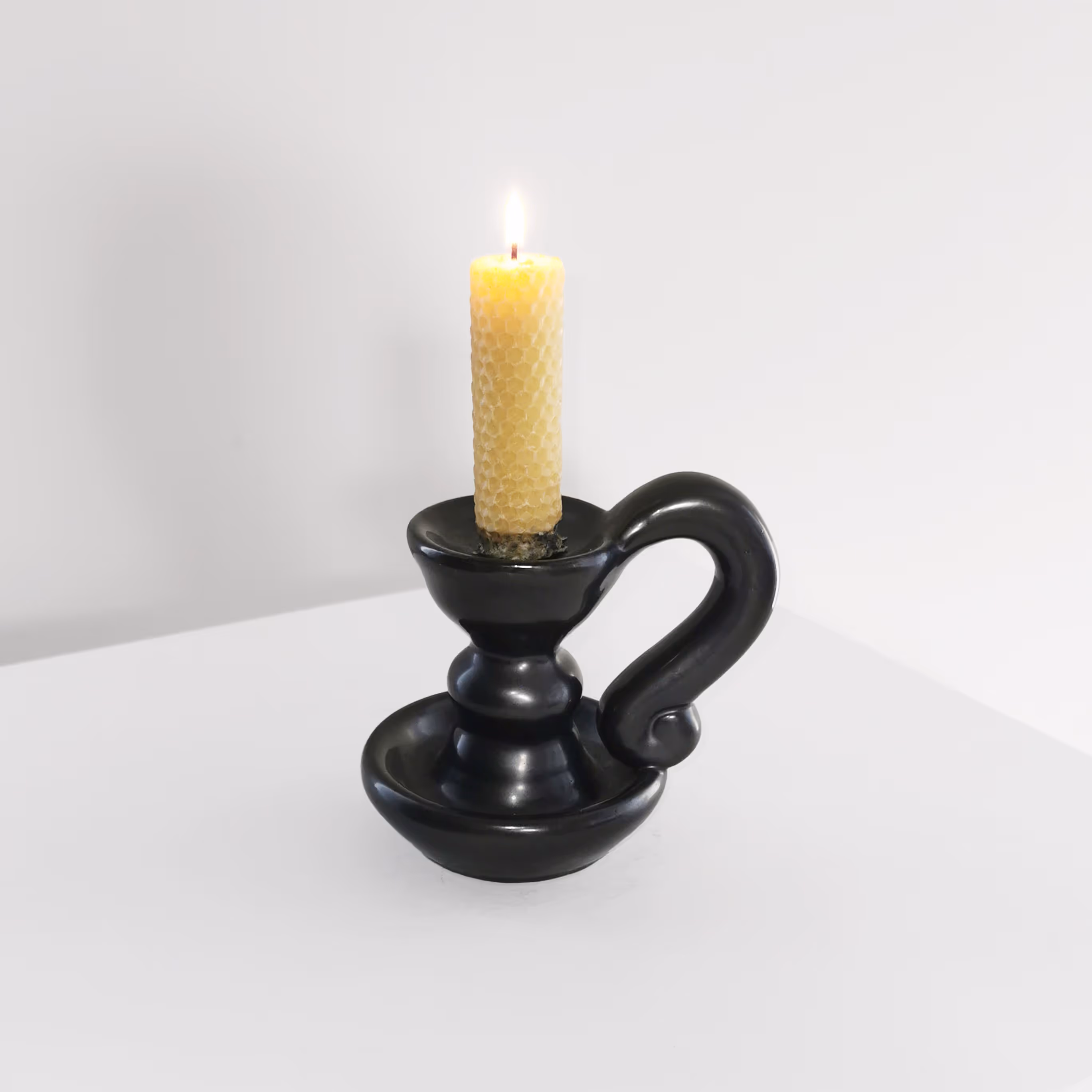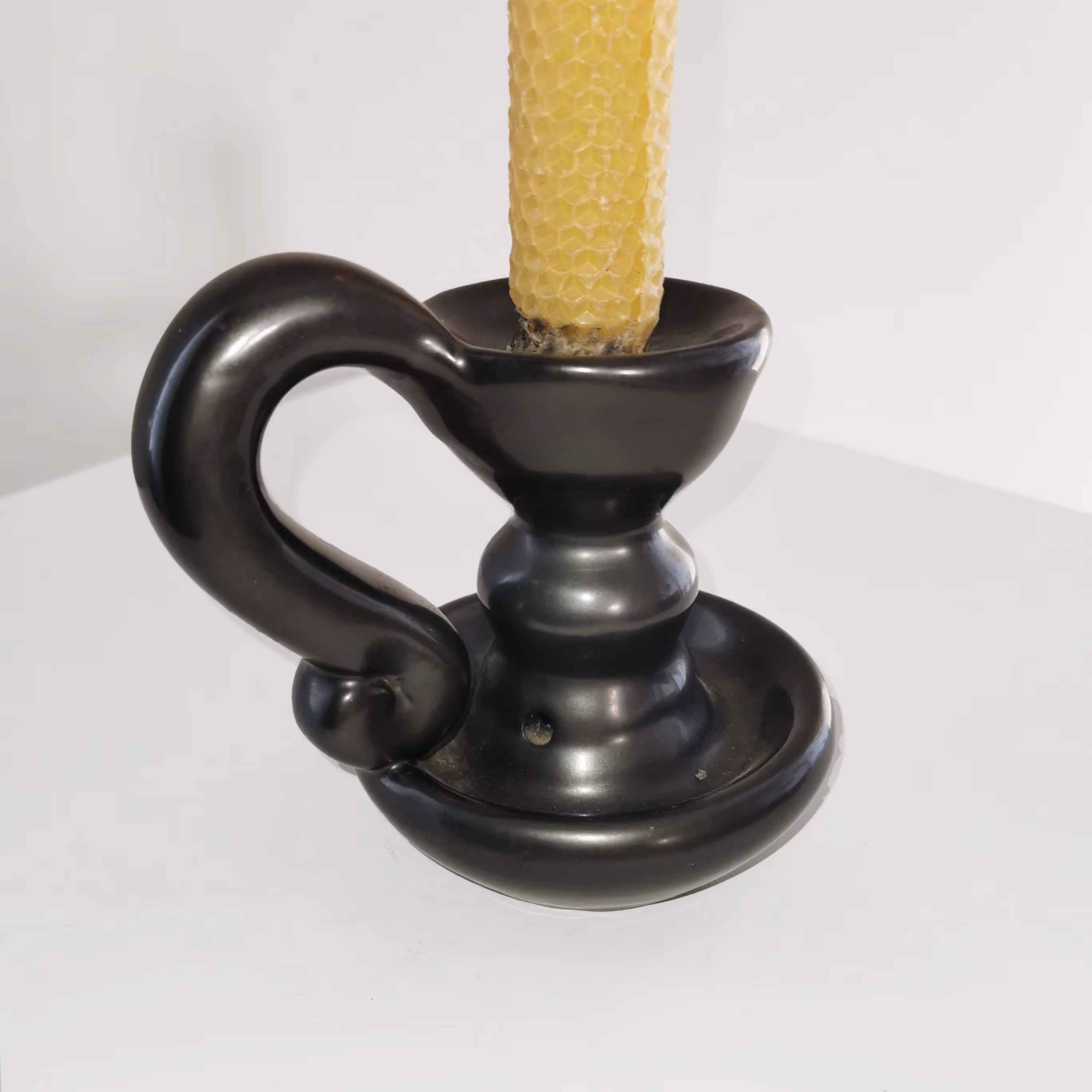 Set of three mat black glaze pottery candlesticks.