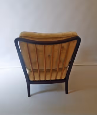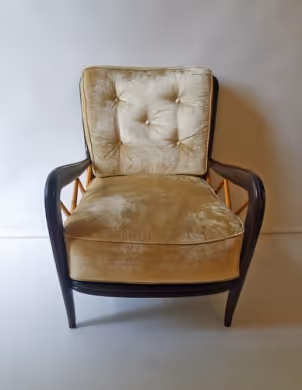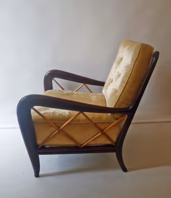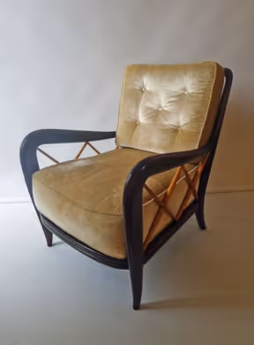 A rosewood and maple armchair with vanilla crushed velvet cushions. A design often attributed to Paolo Buffa.