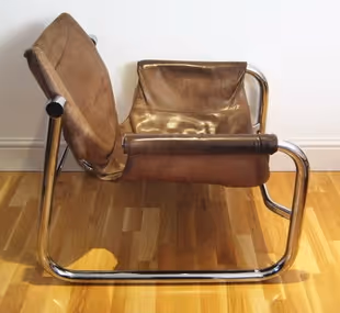 Chrome structure immaculate and nicely patinated brown leather seat and back