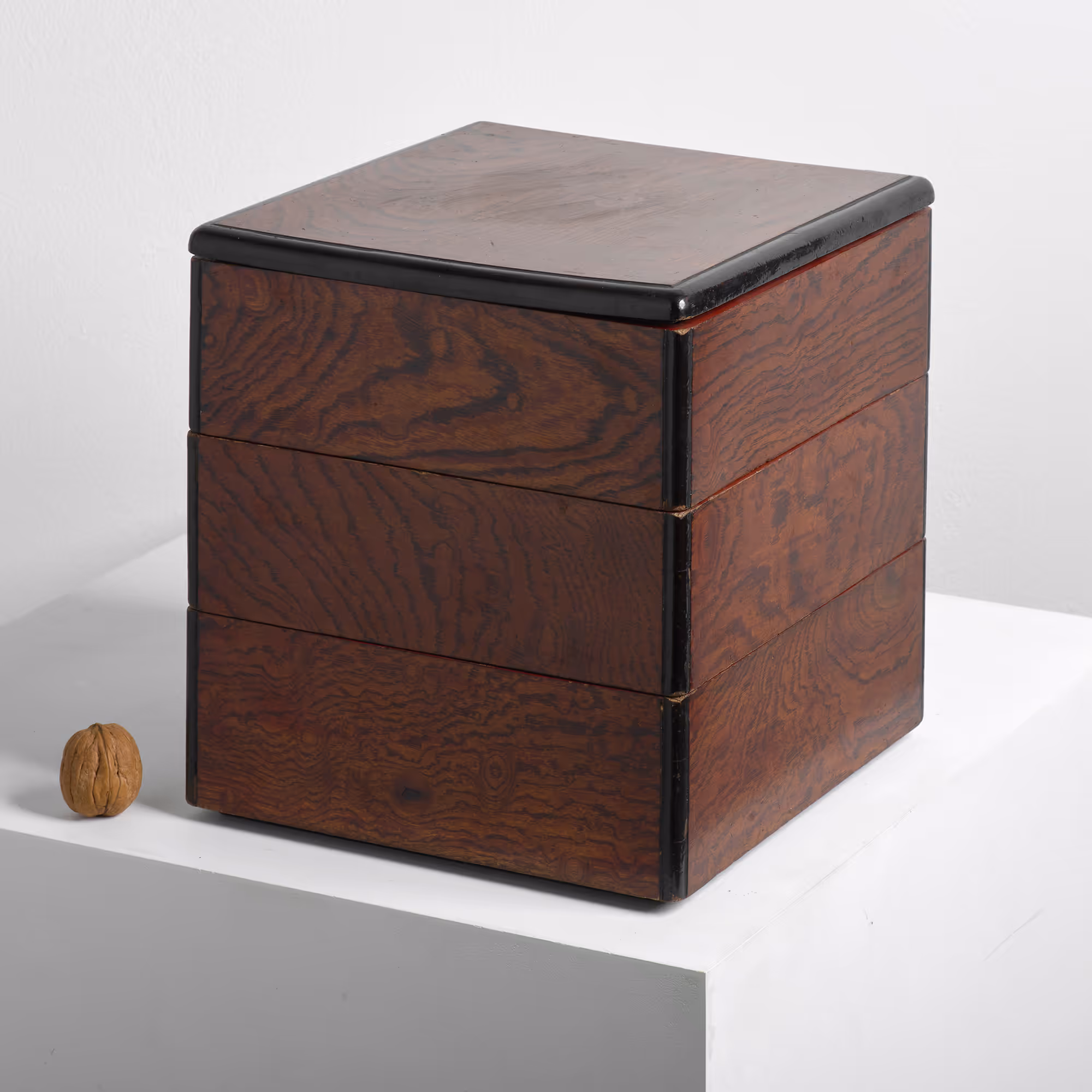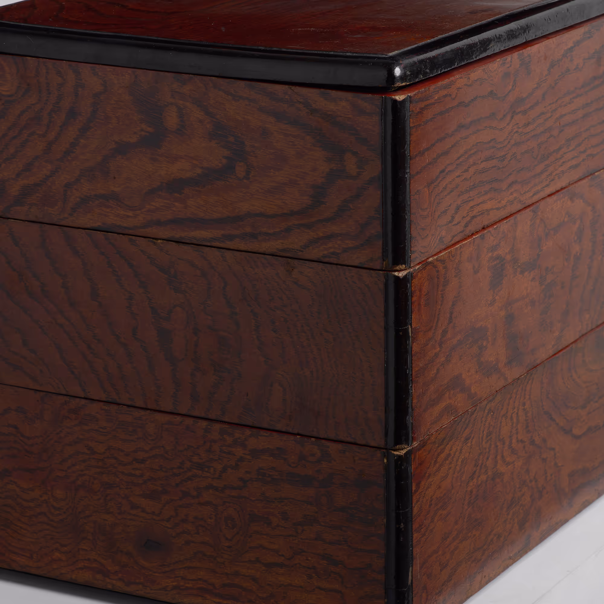 A three-tier, grained lacquer bento box.