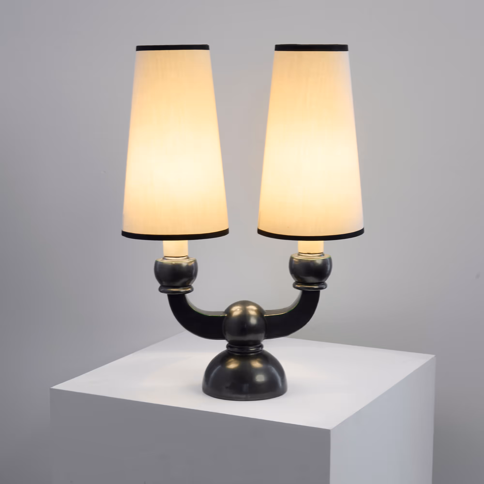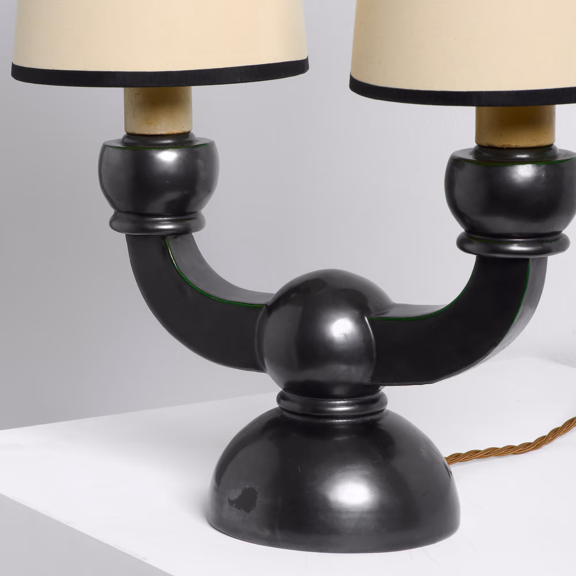 Black ceramic, two-way table lamp by Robert Bonnefille aka Bonfil (1886-1976).