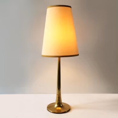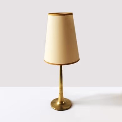 An elegant brass table lamp in the shape of a trumpet with bespoke shade. Rewired & PAT-certified
