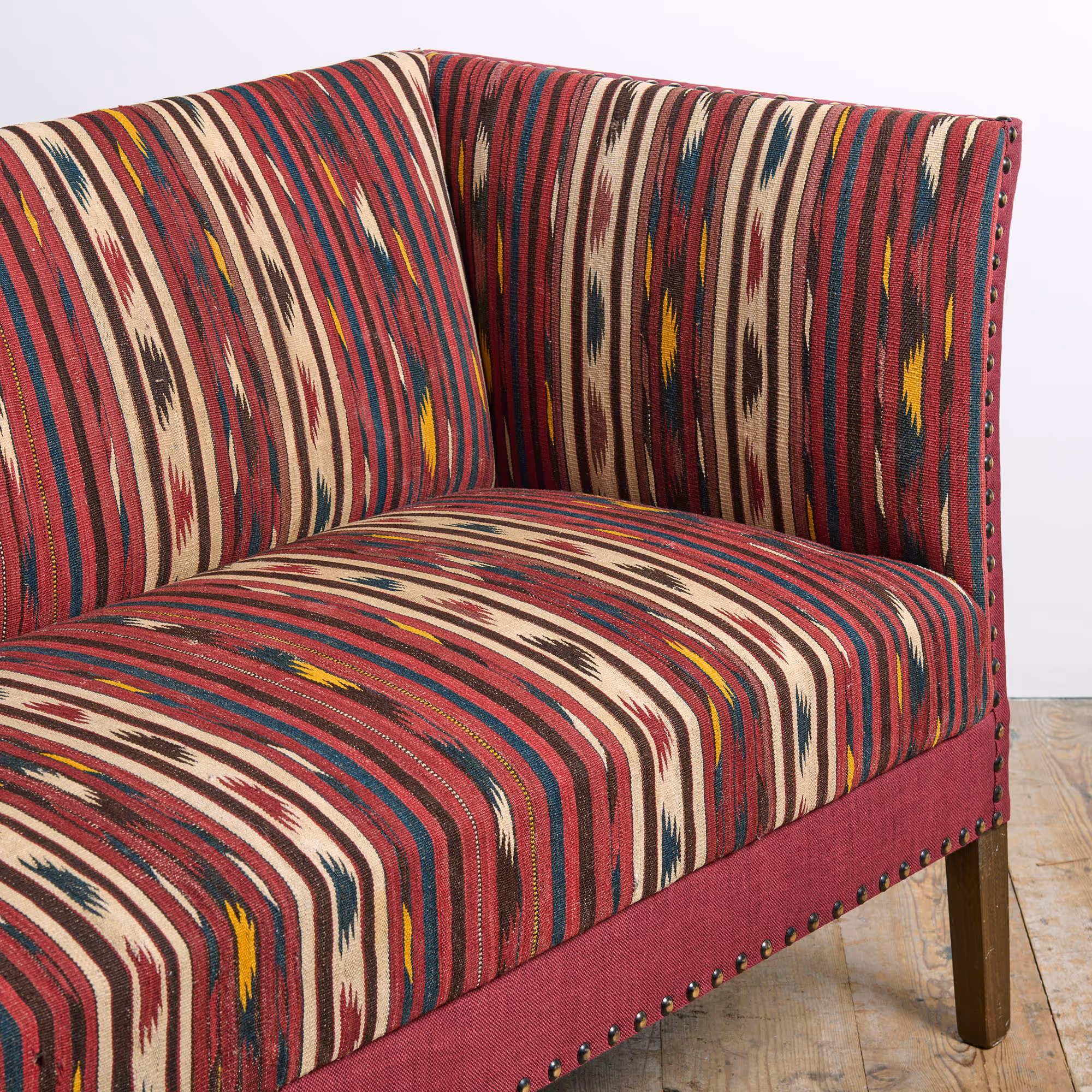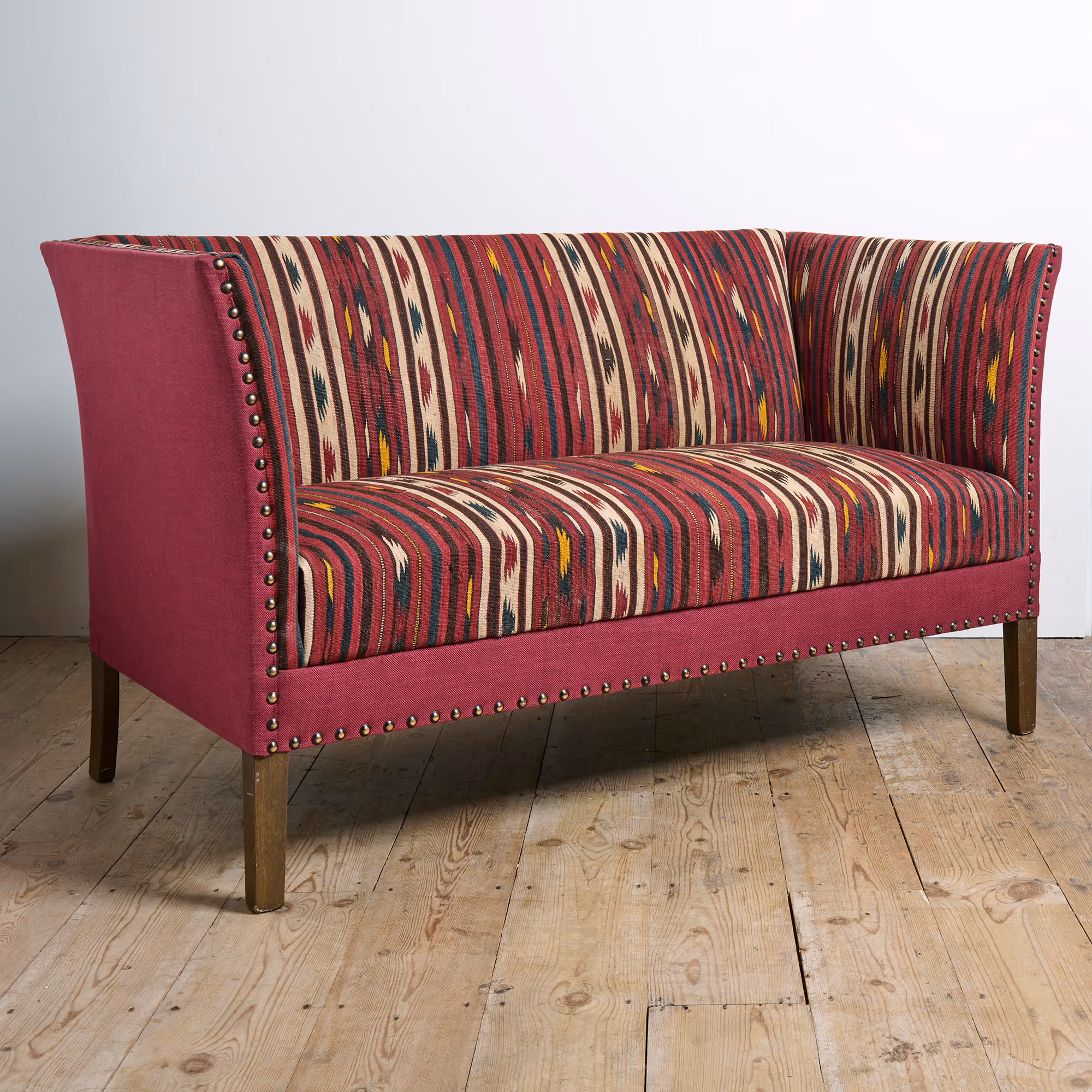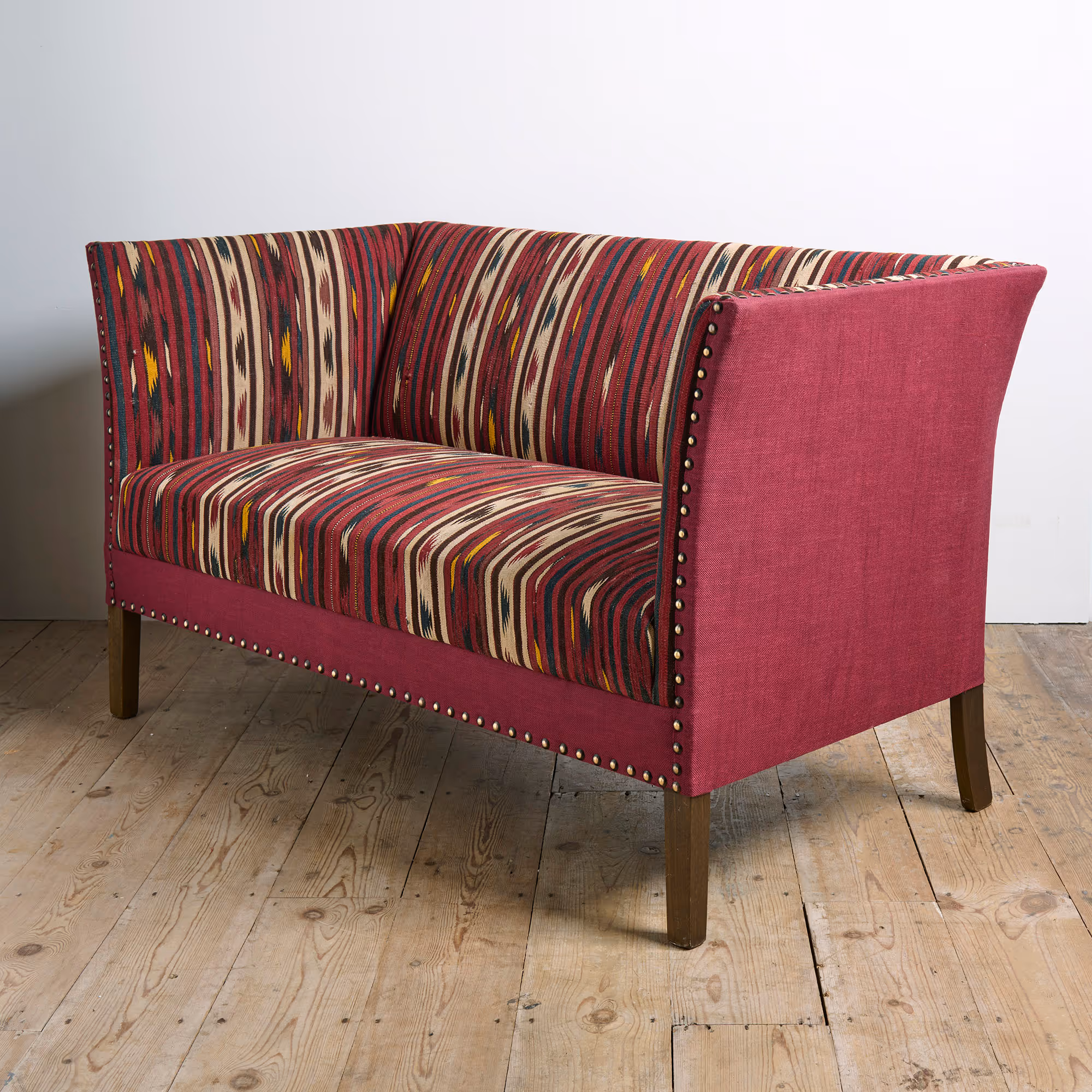 Compact box frame sofa, recently reupholstered in antique wool flatweave fabric.