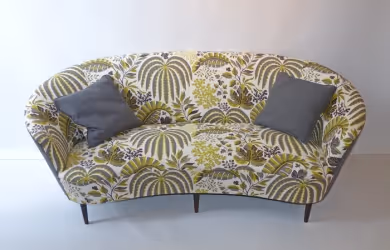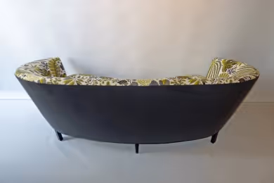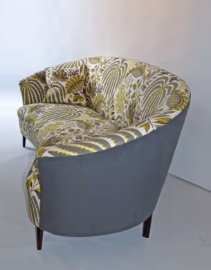 A curved sofa recently reupholstered in a floral cotton-linen mix with contrasting plain grey back. Comes with a matching pair of scatter cushion (floral front, plain back)