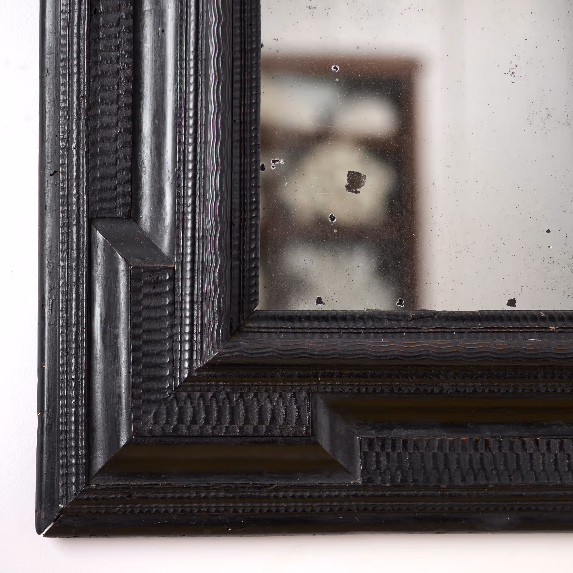 Dutch mirror assembled in the nineteenth century using sections of original ebonised wood frame from the seventeenth century. Mercury plate.