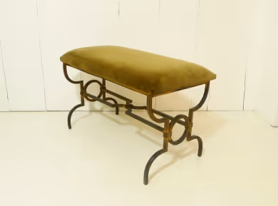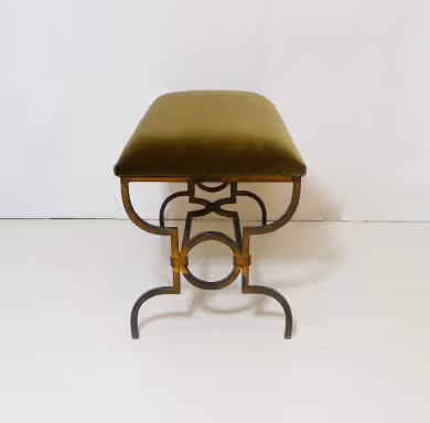 A gilt iron bench in the manner of Gilbert Poillerat. Newly reupholstered in velvet.