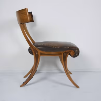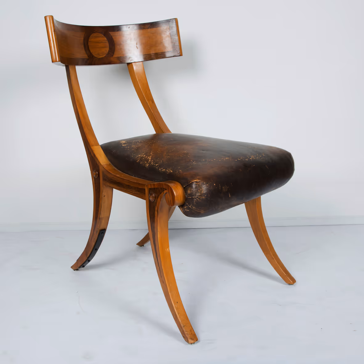 Klismos chair with original faux leather canvas seat. Veneered walnut & rosewood inlay.
