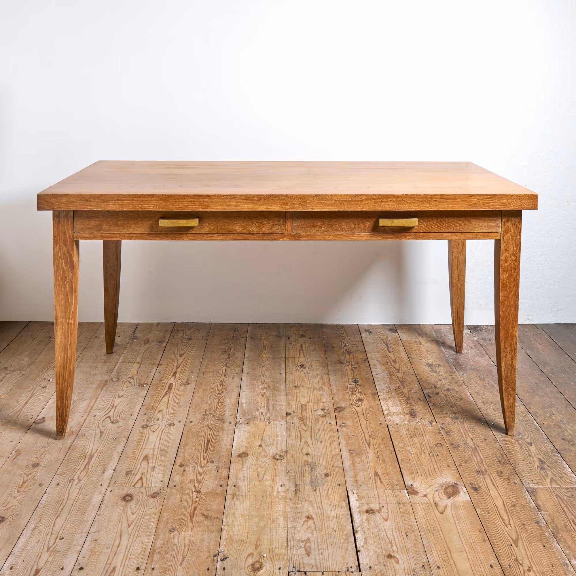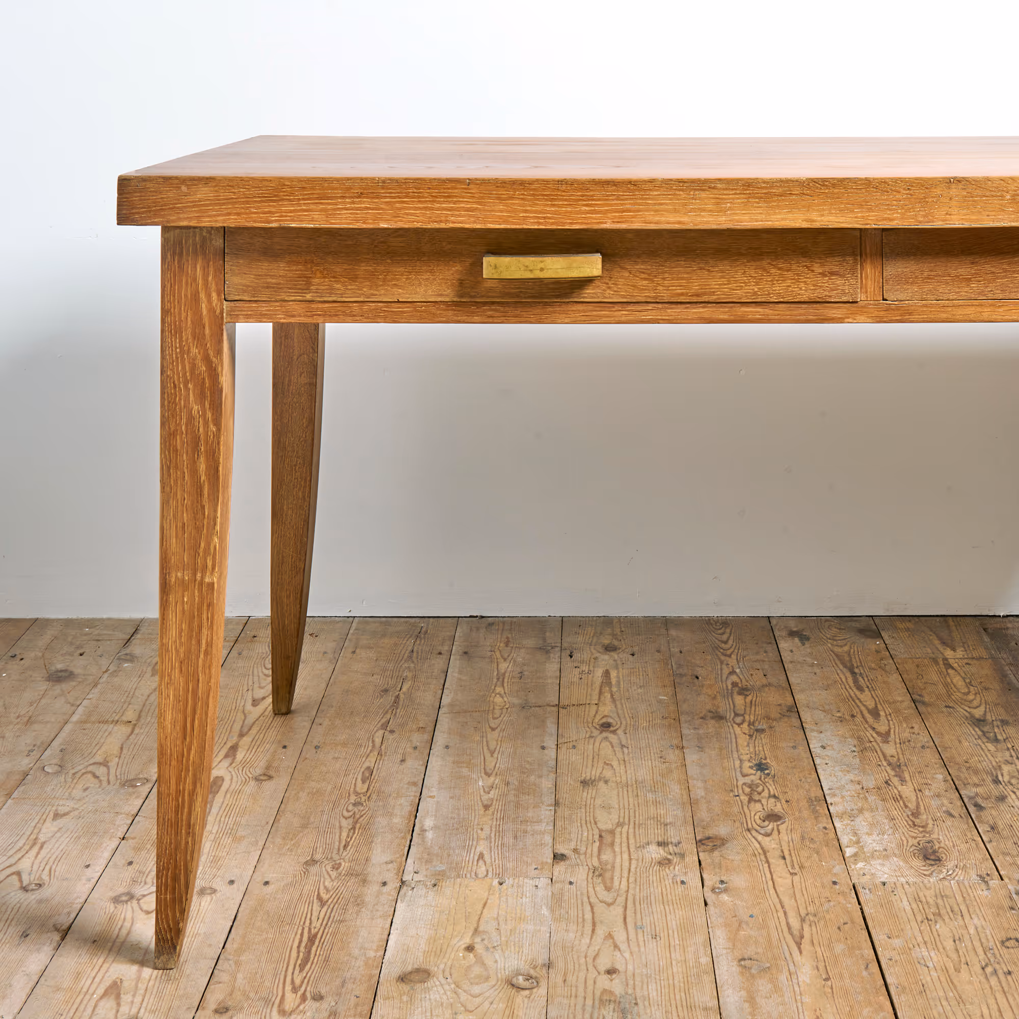 Large oak desk with sabre legs and two drawers.