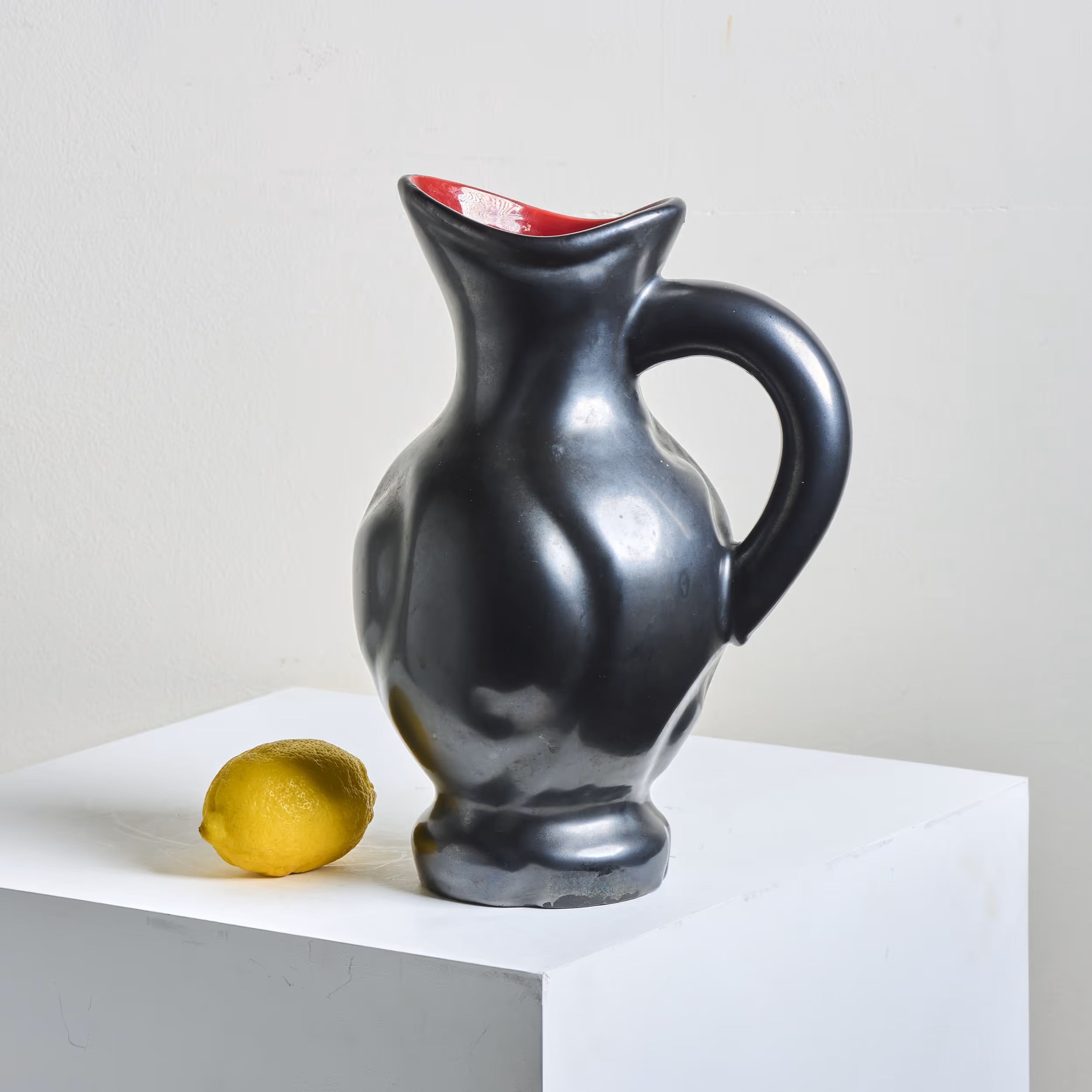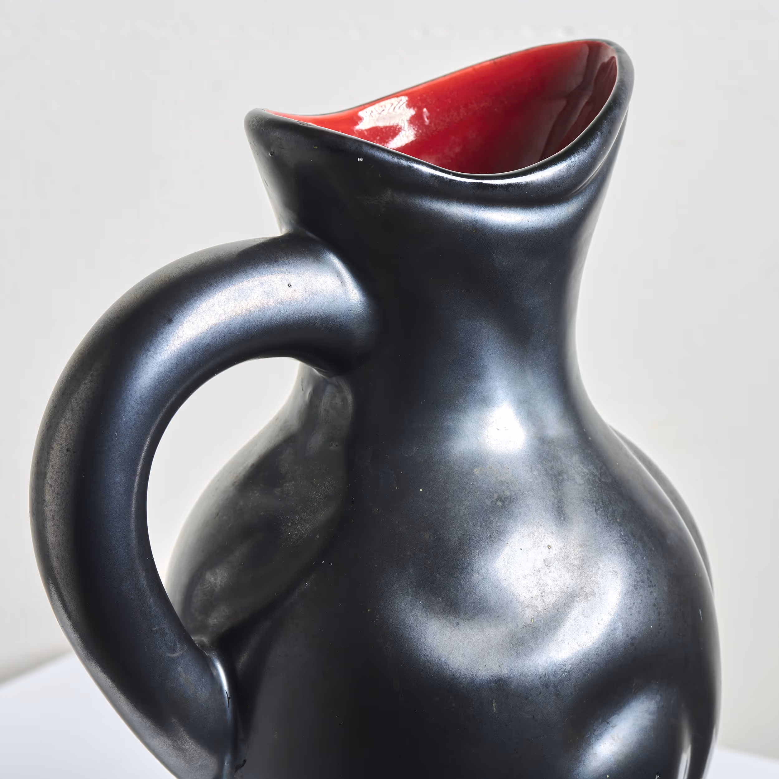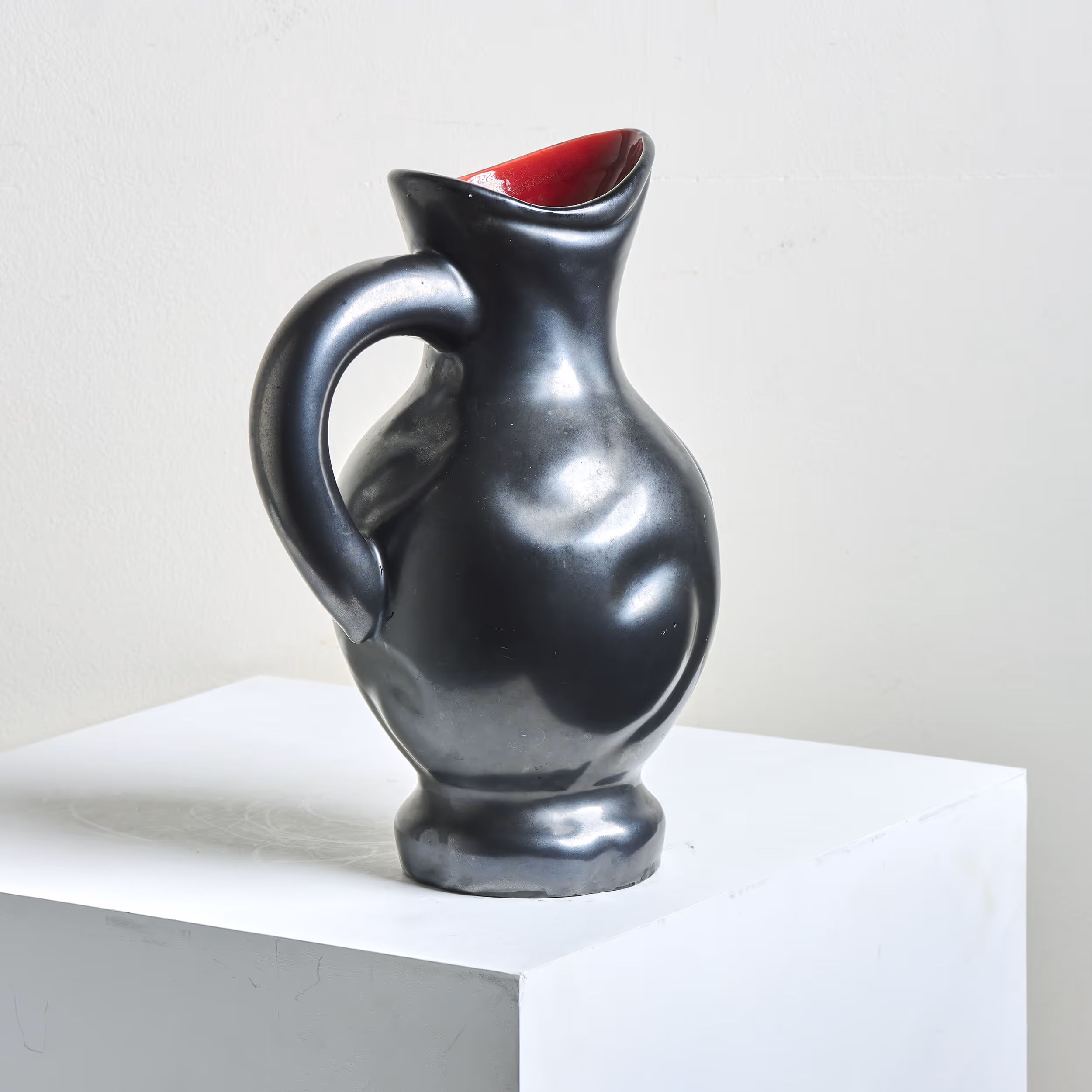 Large semi-mat black pottery jug with red interior.