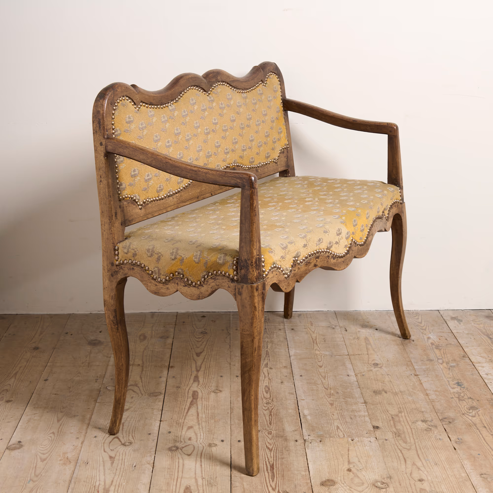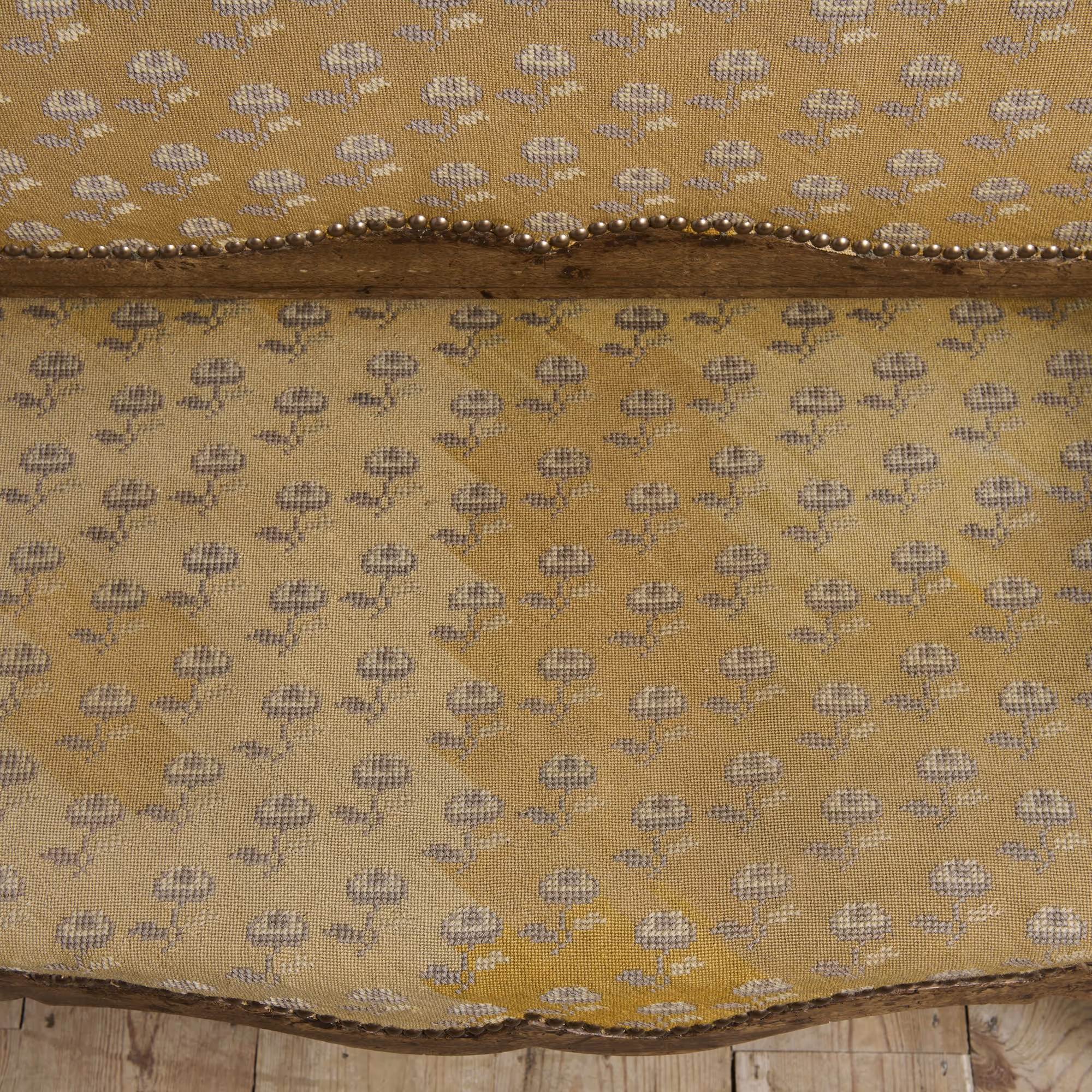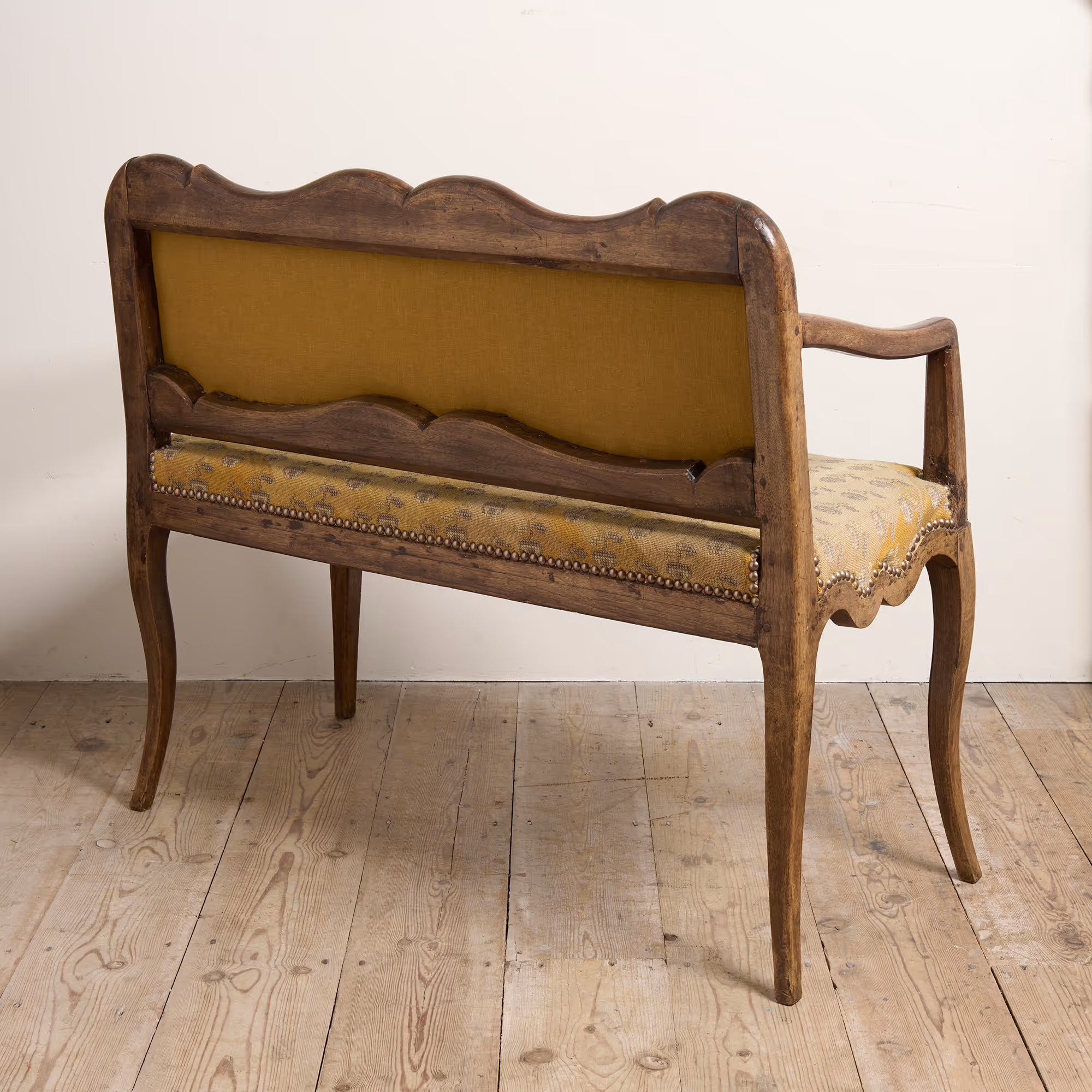 Small settle with wavy back and apron, and cabriole legs. Recently restored and reupholstered using its early twentieth-century petit-point tapestry (the differences in yellow wool batches forming their own random pattern)