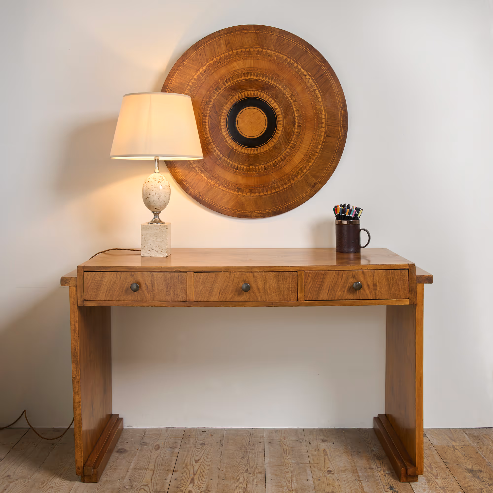 Circular marquetry table top used as wall decoration. Inlay designs typical of the woodwork tradition originating from the town of Rolo, northen Italy.
