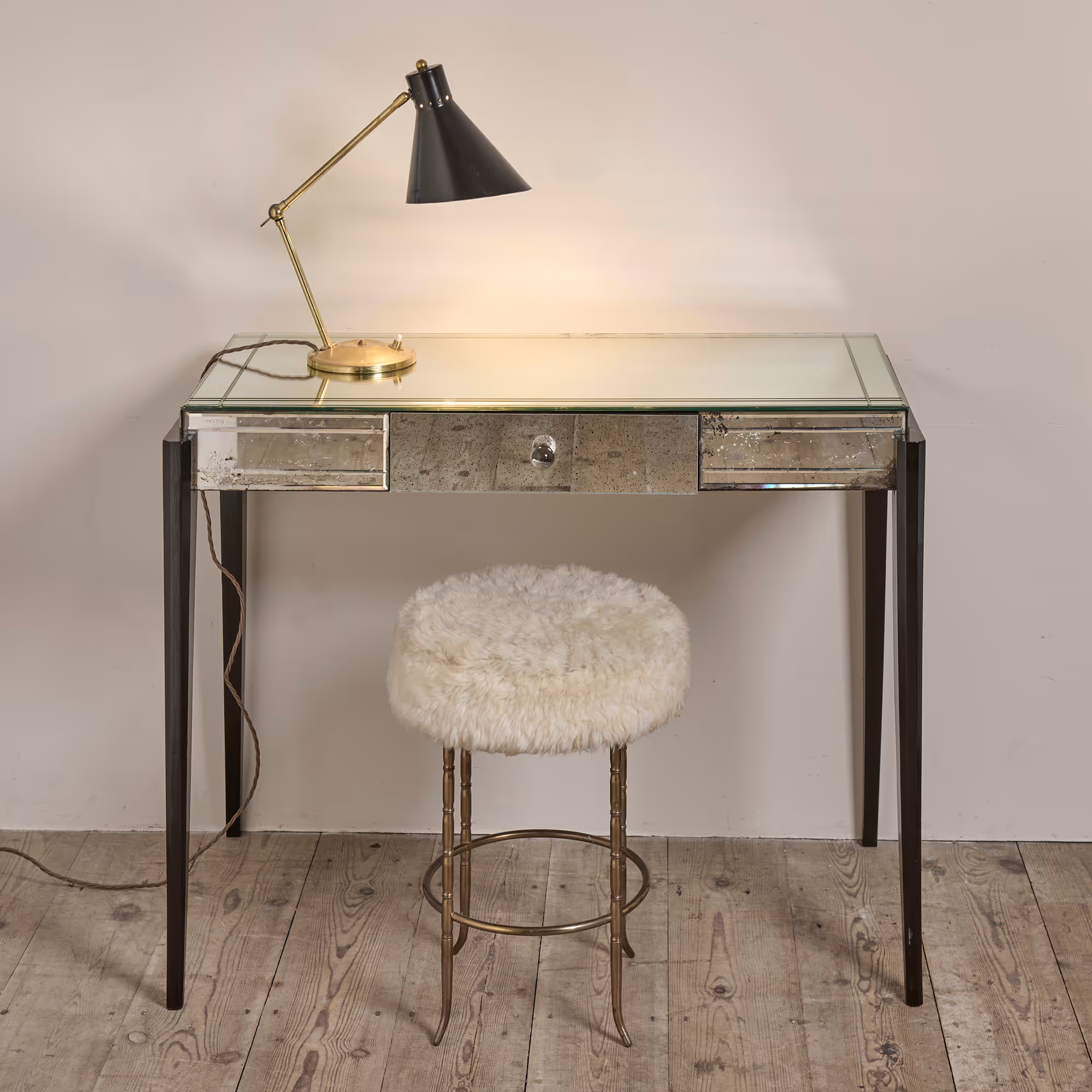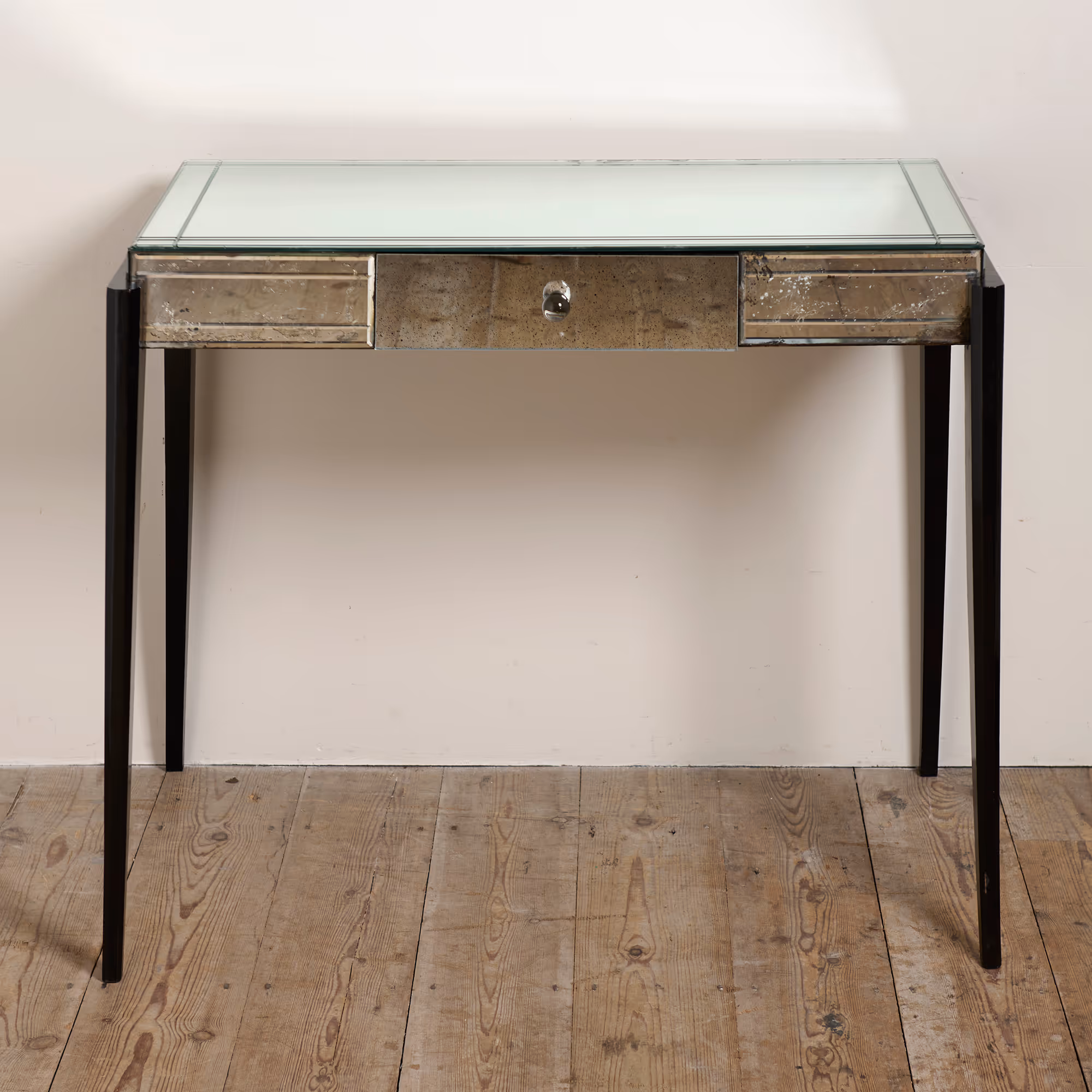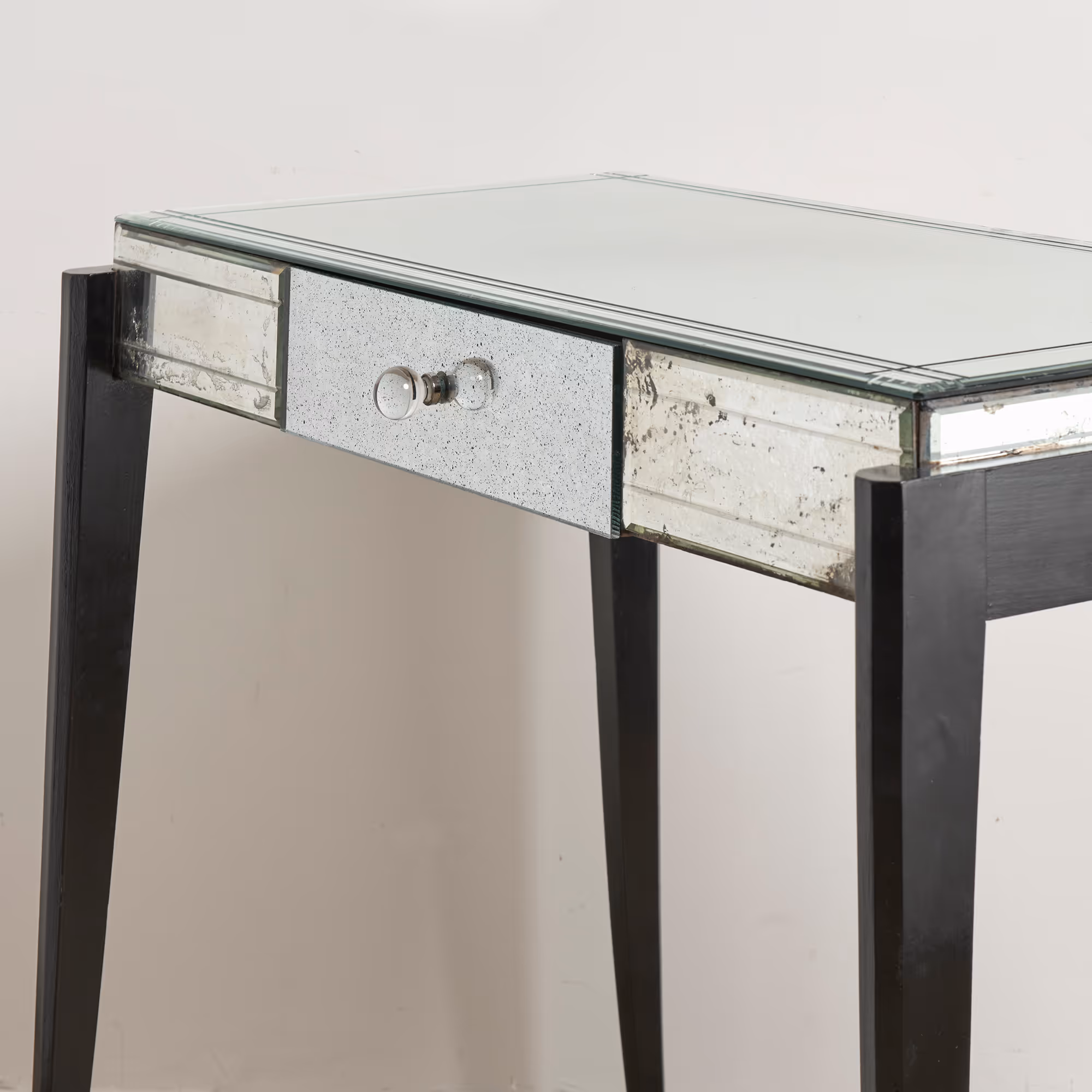 Mirrored dressing table with faceted, ebonised legs. One drawer.