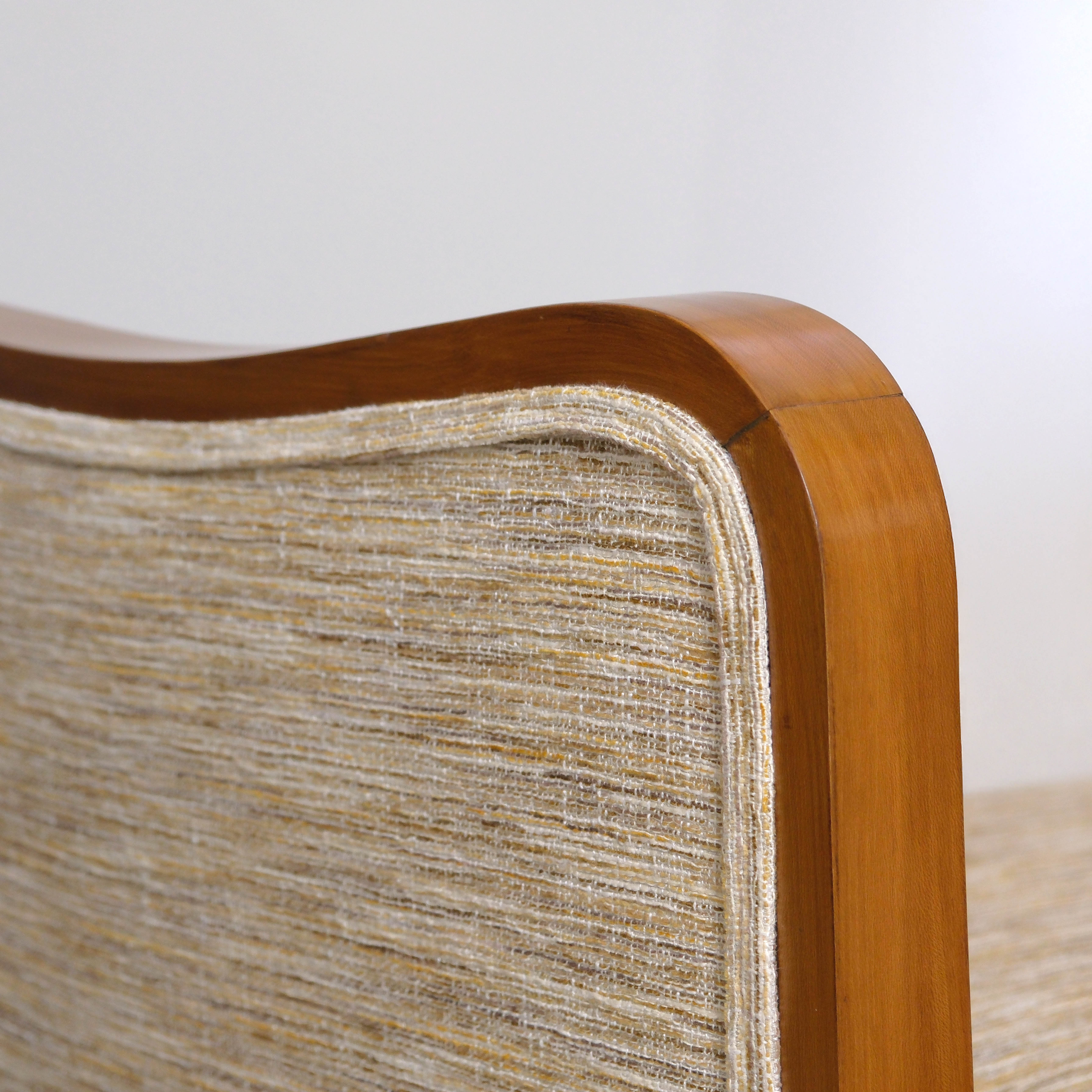 Both arms drop to allow the sitter to recline. Recently reupholstered in a warm neutral, textured fabric.