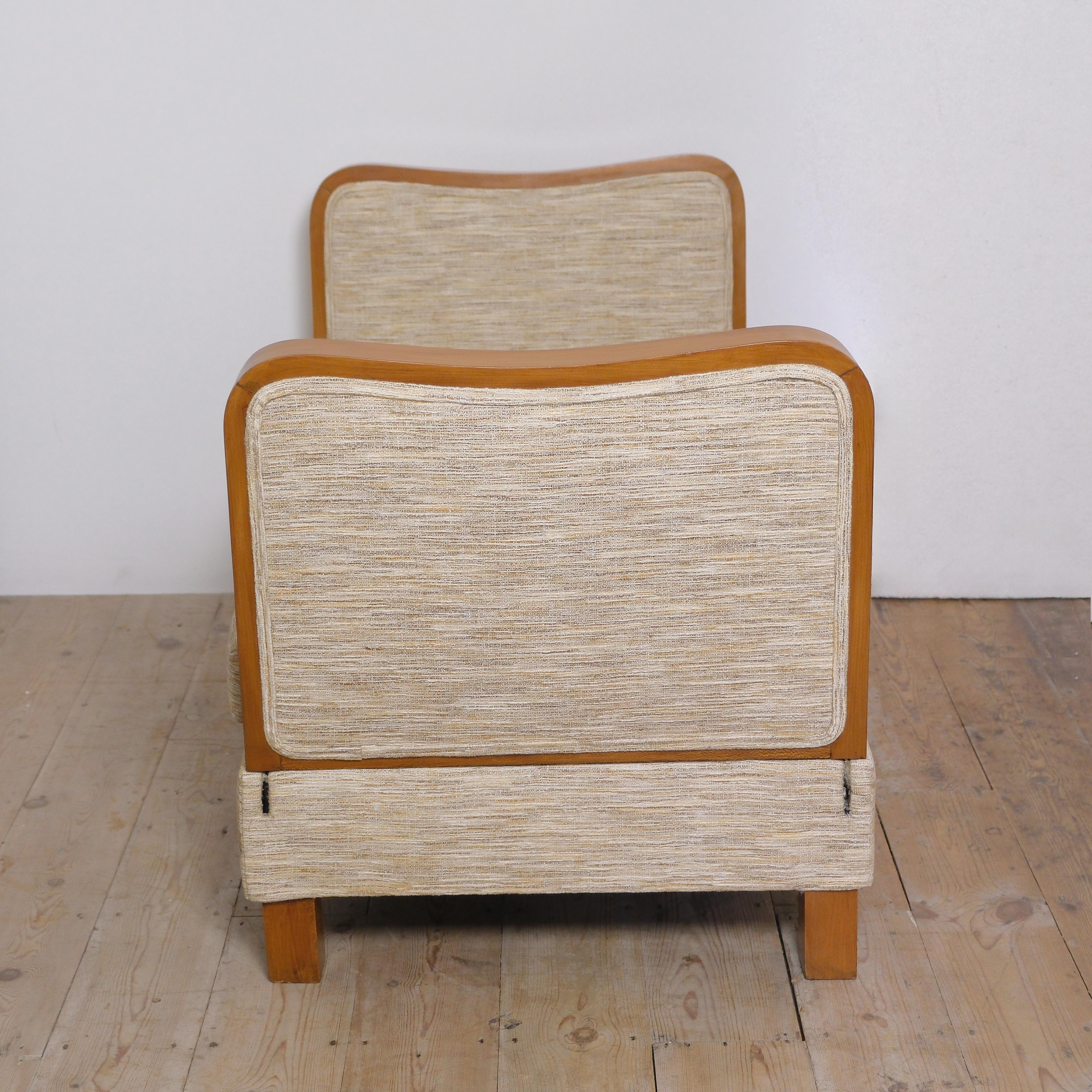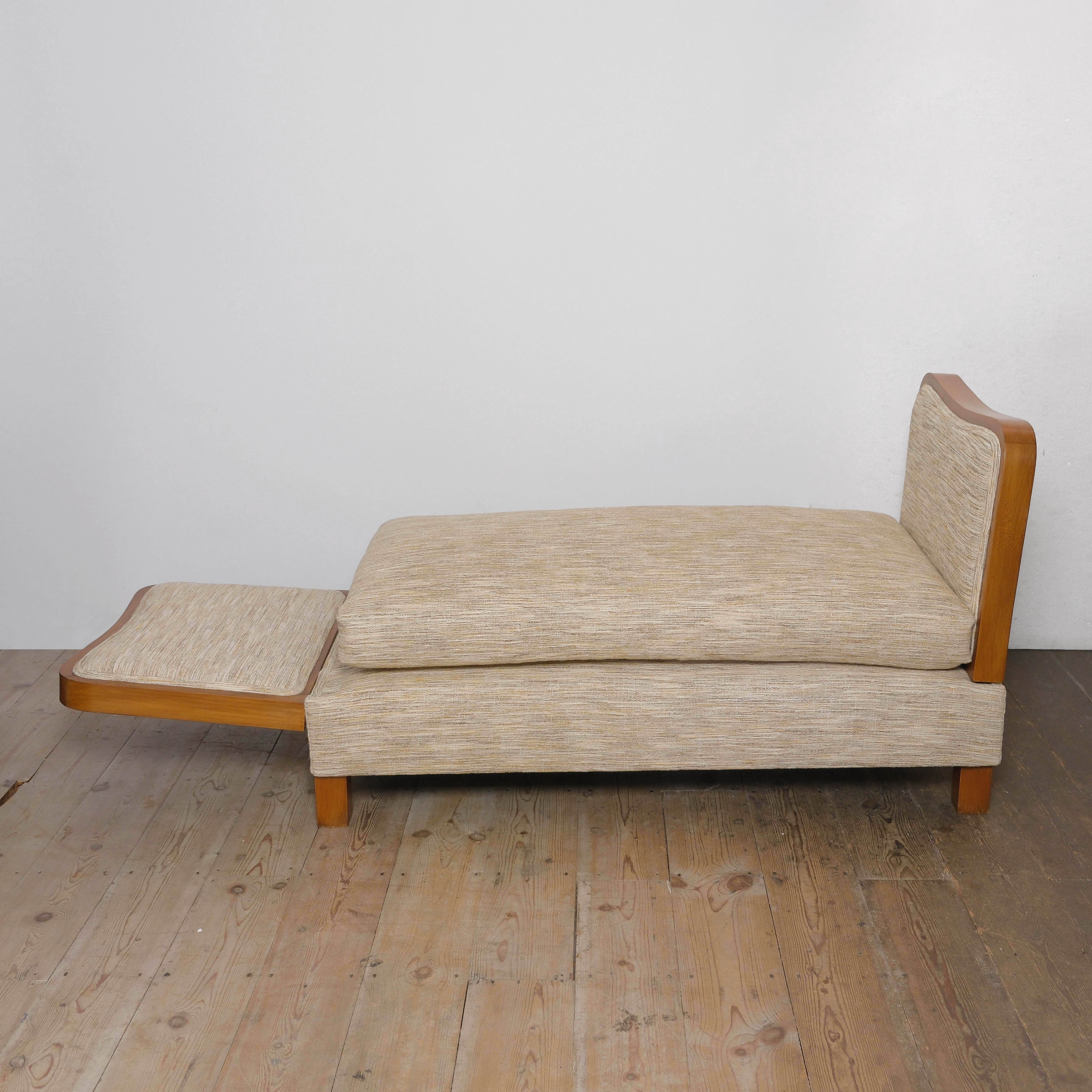 Compact daybed with wavy frames around the arms reminiscent of a larger daybed designed by Jean Royère in 1946 (see third picture, courtesy of Sotheby’s Paris, 2023).