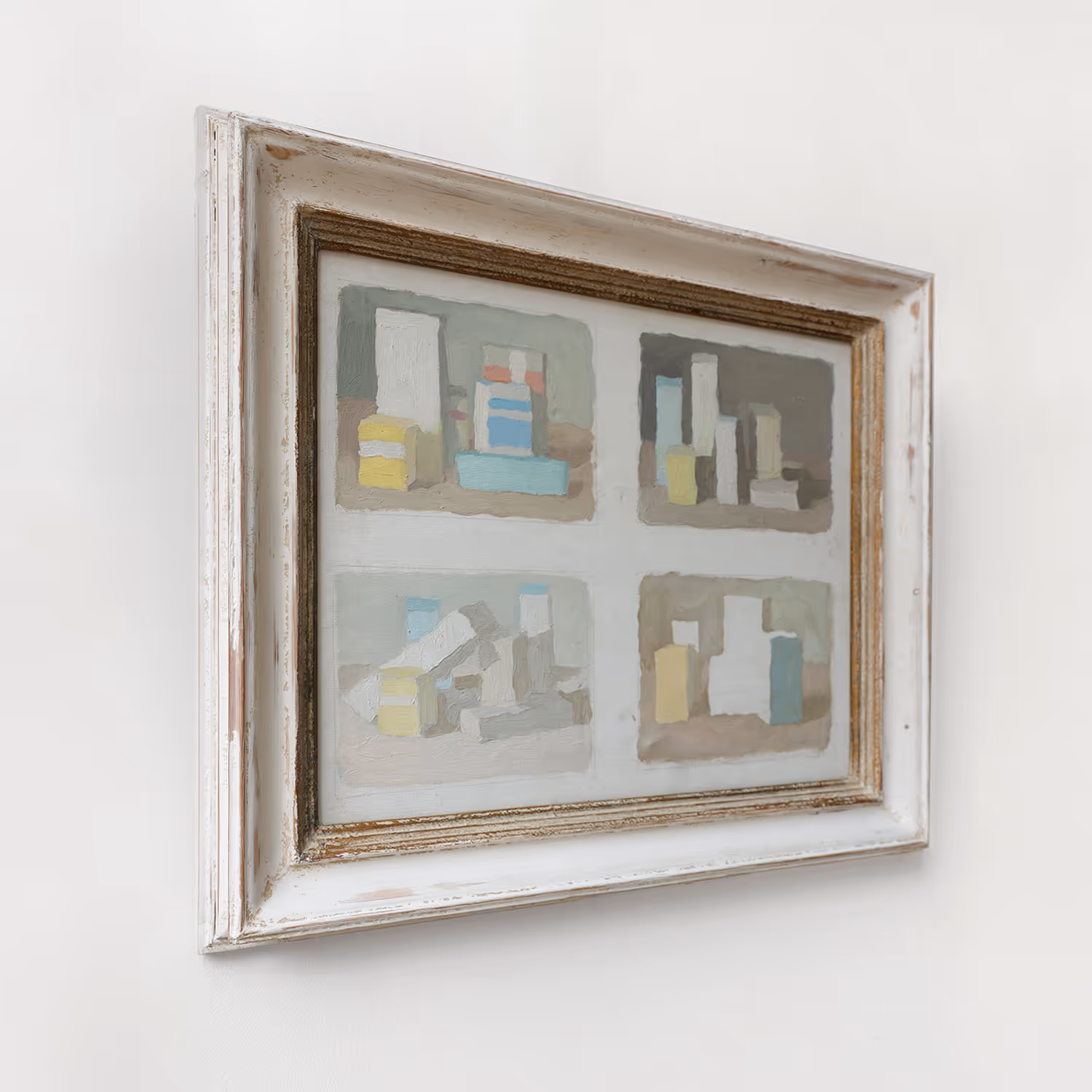 Oil on canvass, signed and dated on reverse Jacques Daniel, 1969. Four vignettes representing still lives in the manner of Giorgio Morandi. The artist has used a peaceful pastel palette to demonstrate his understanding of volume, light and shadow.
