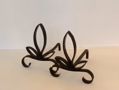 A pair of hand-beaten iron firedogs with stylised flame design at the front