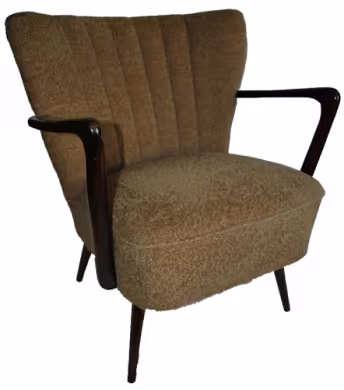 A pair of cocktail chairs with spindle legs and armrests in dark wood, and original upholstering in taupe bouclé wool