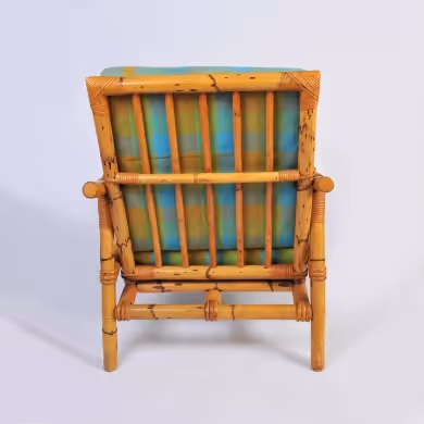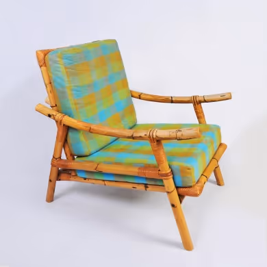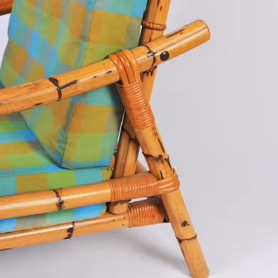 Pair of bamboo armchairs of excellent construction, with great sweeping armrests. Drop seat & back cushions (in need of recovering).