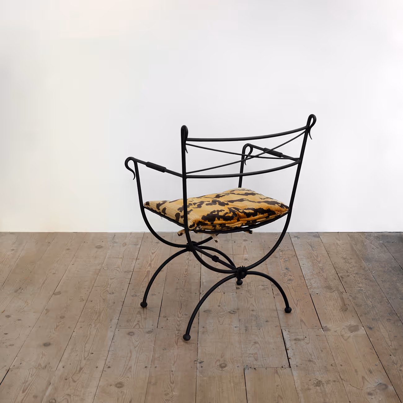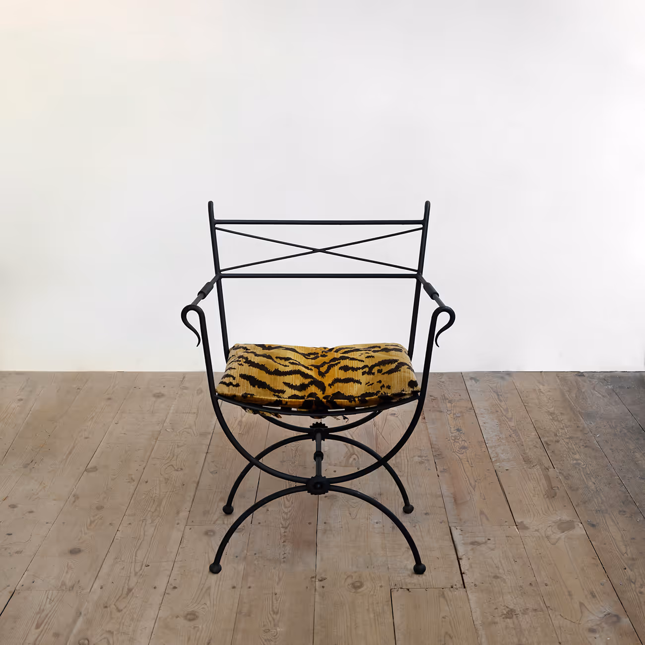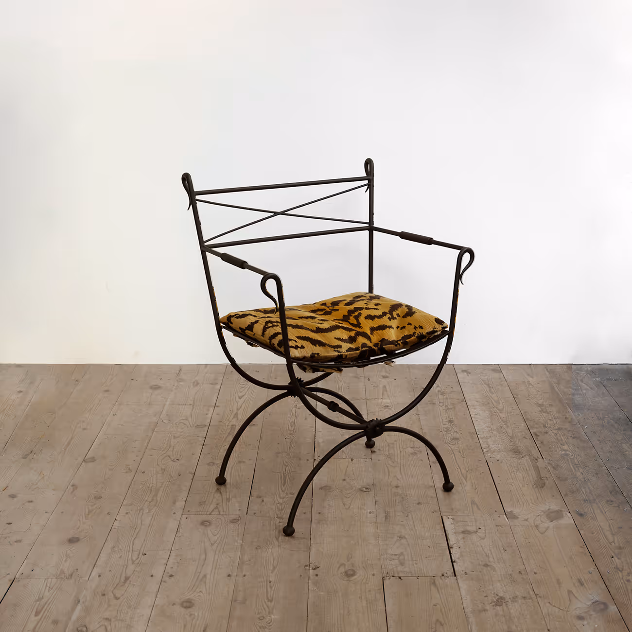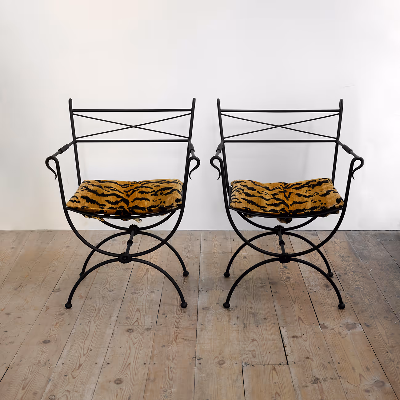 A pair of elegant steel armchairs with curule-shaped seats, almost certainly by to Rene Prou (1887-1947).