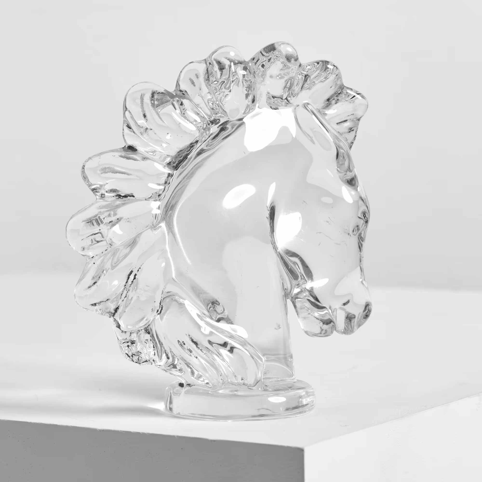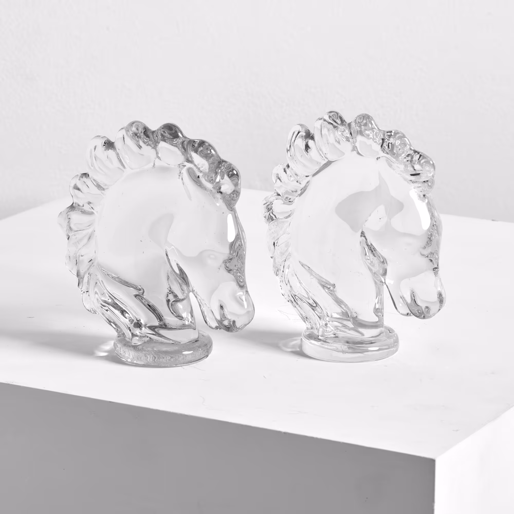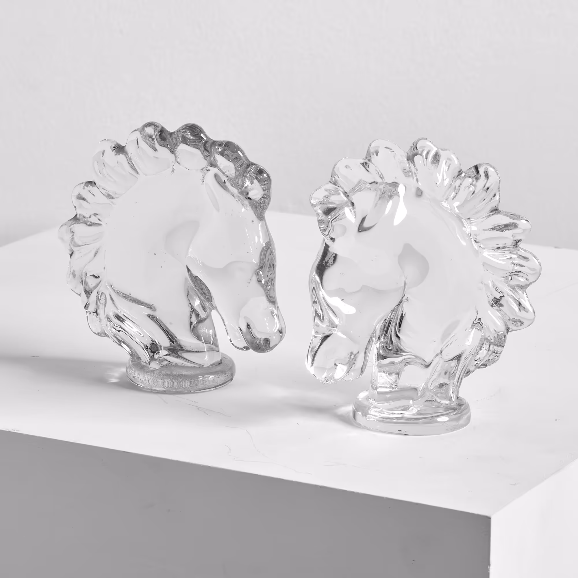 Pair of hand-blown glass paperweights in the shape of horses heads.