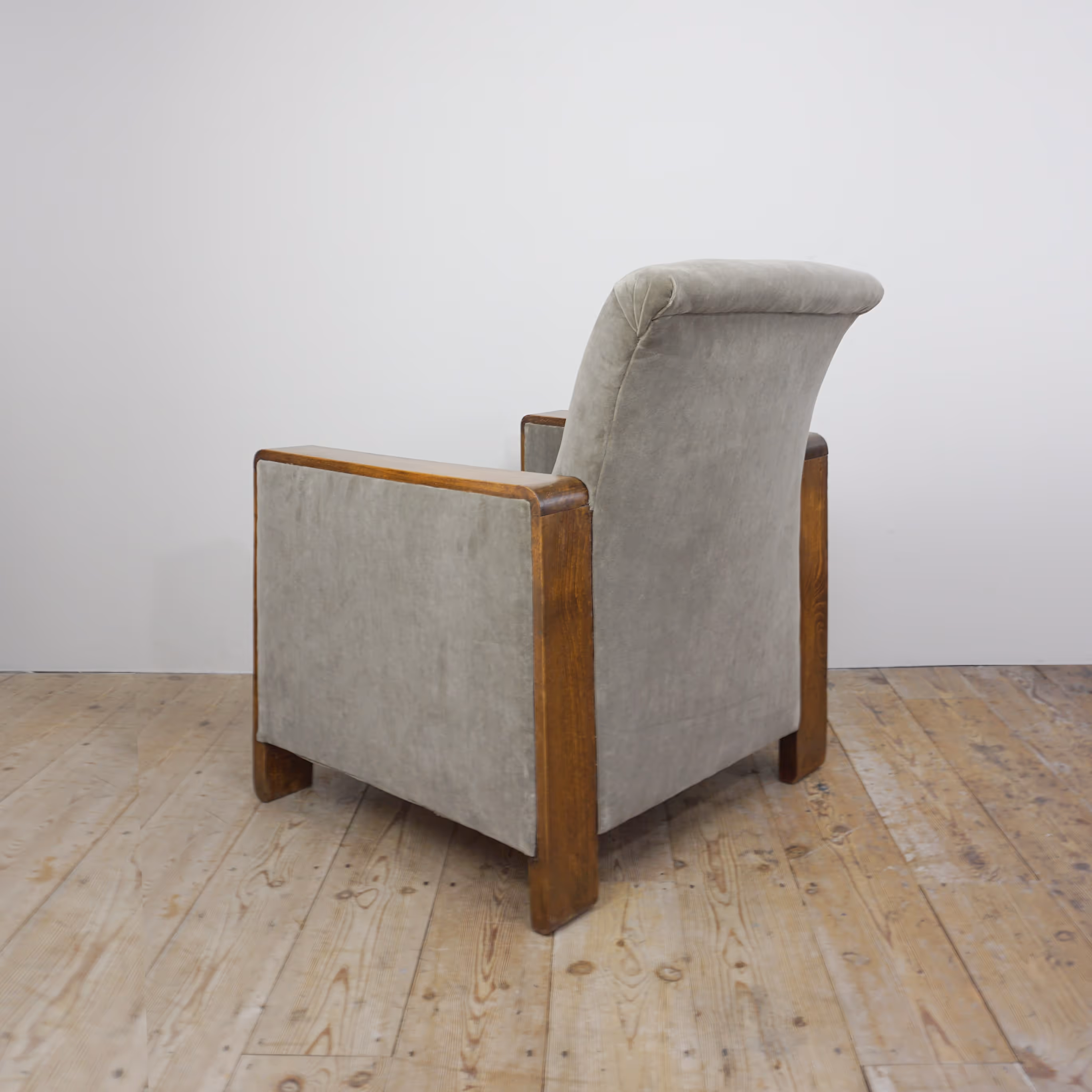 Pair of Art Deco lounge chairs with wooden frame armrest, re-upholstered in bronze velvet.