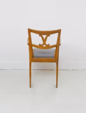 A pair of oak chairs, carved backs and sweeping legs. Newly reupholstered in grey merino wool.