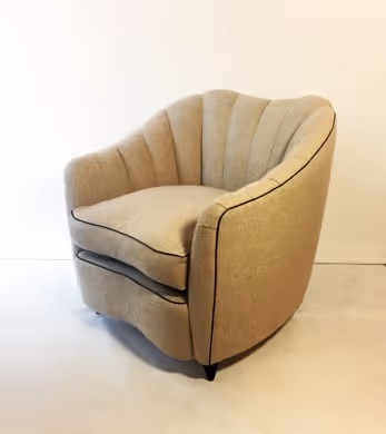 A pair of large armchairs upholstered in a taupe felted wool with leather piping.