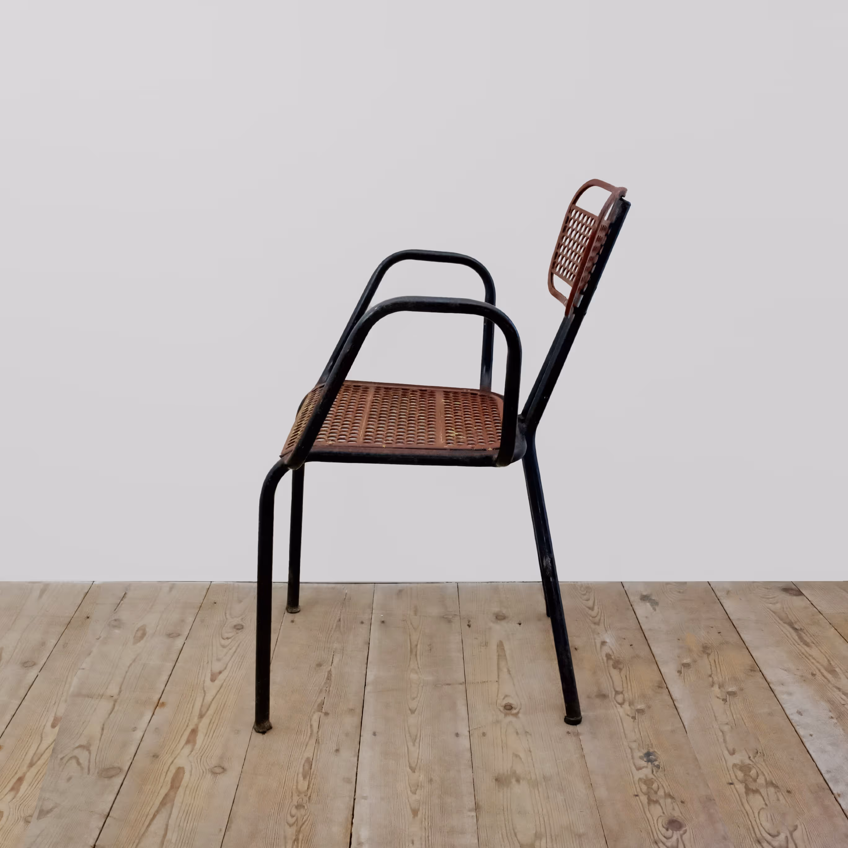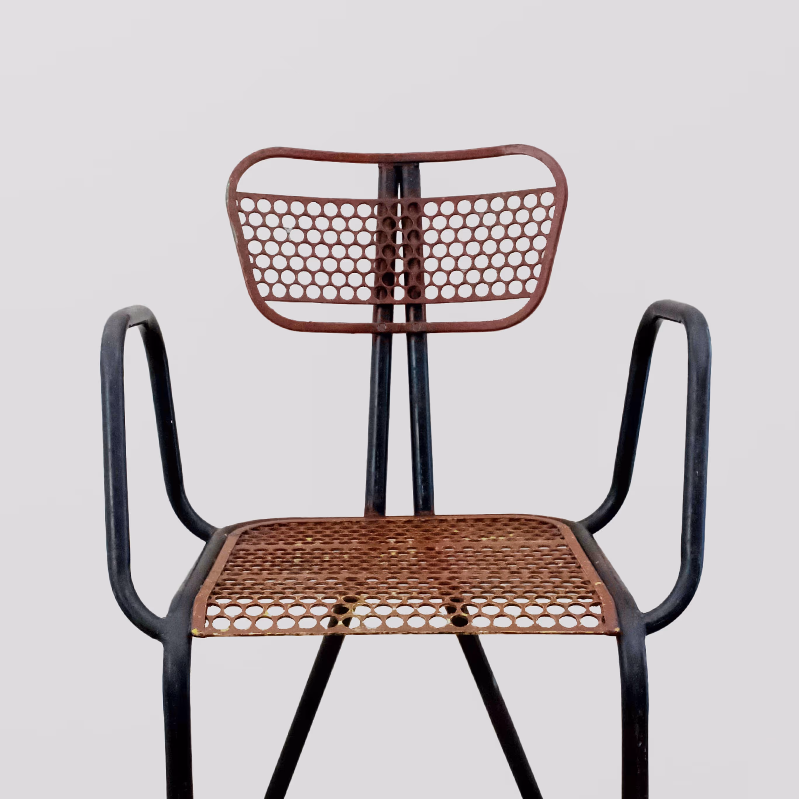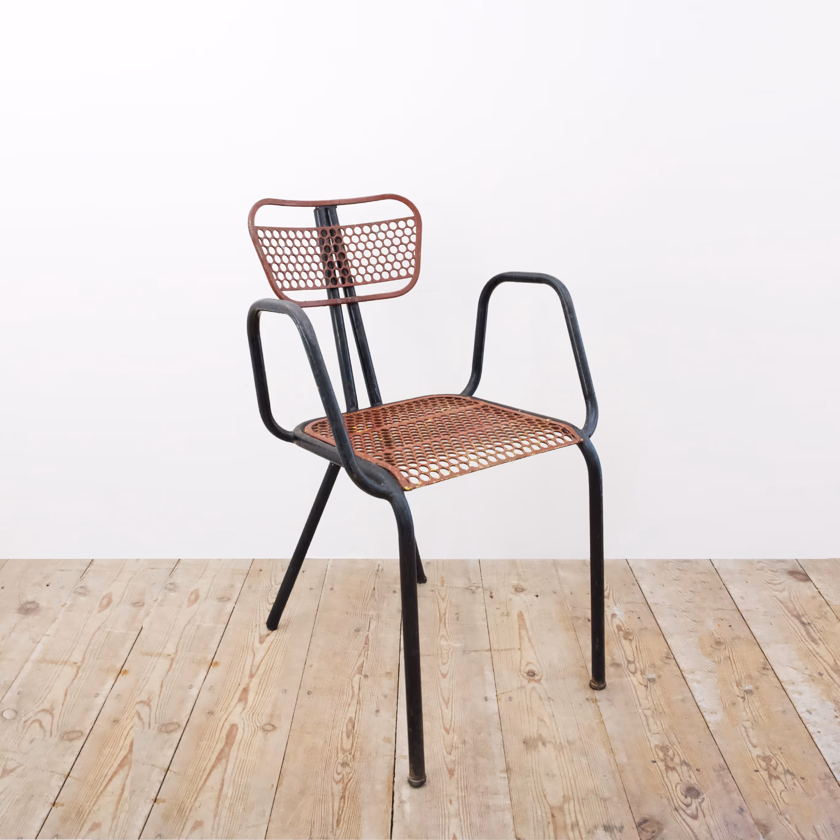 Perforated metal armchair by René Malaval, 1948. Original black and maroon paint.
