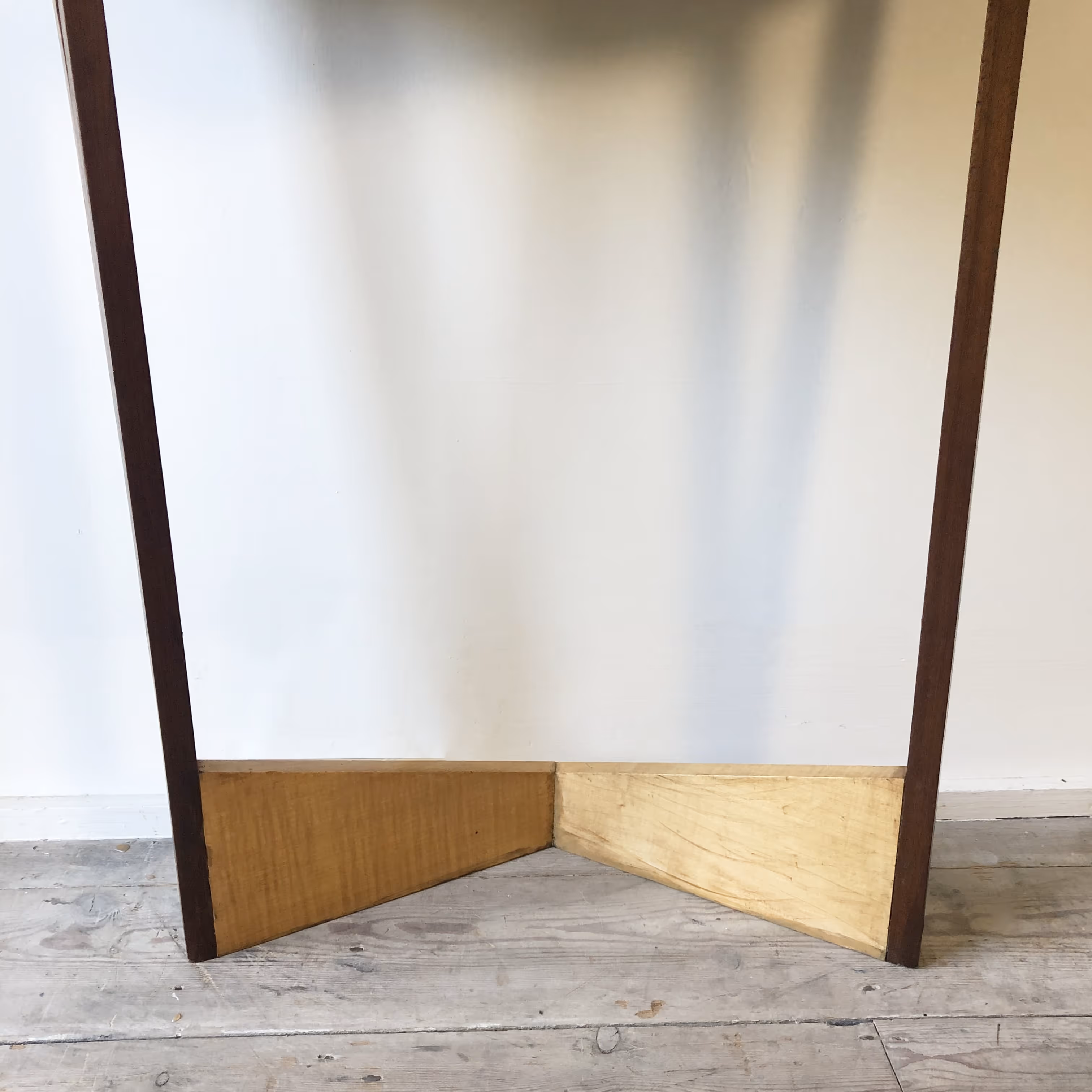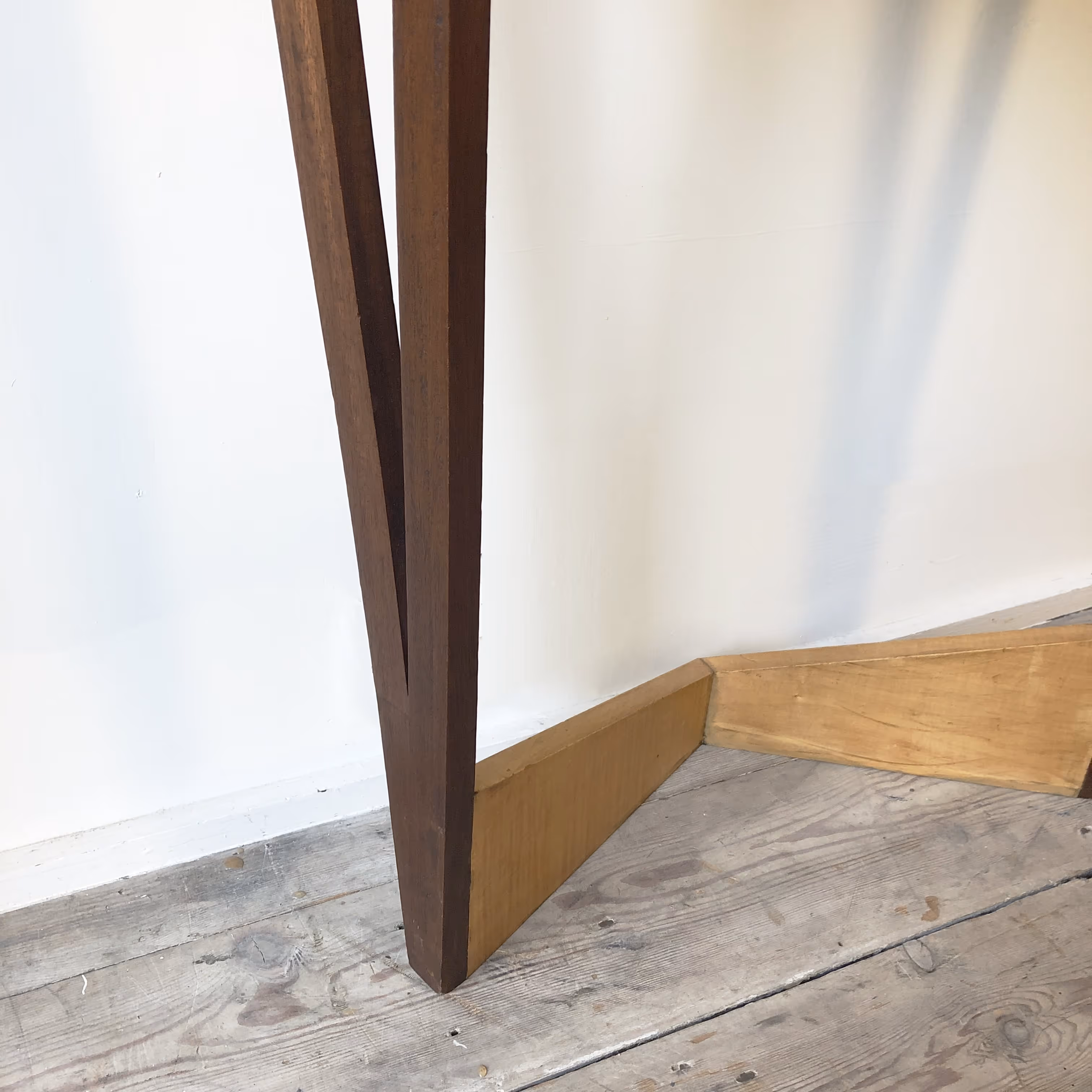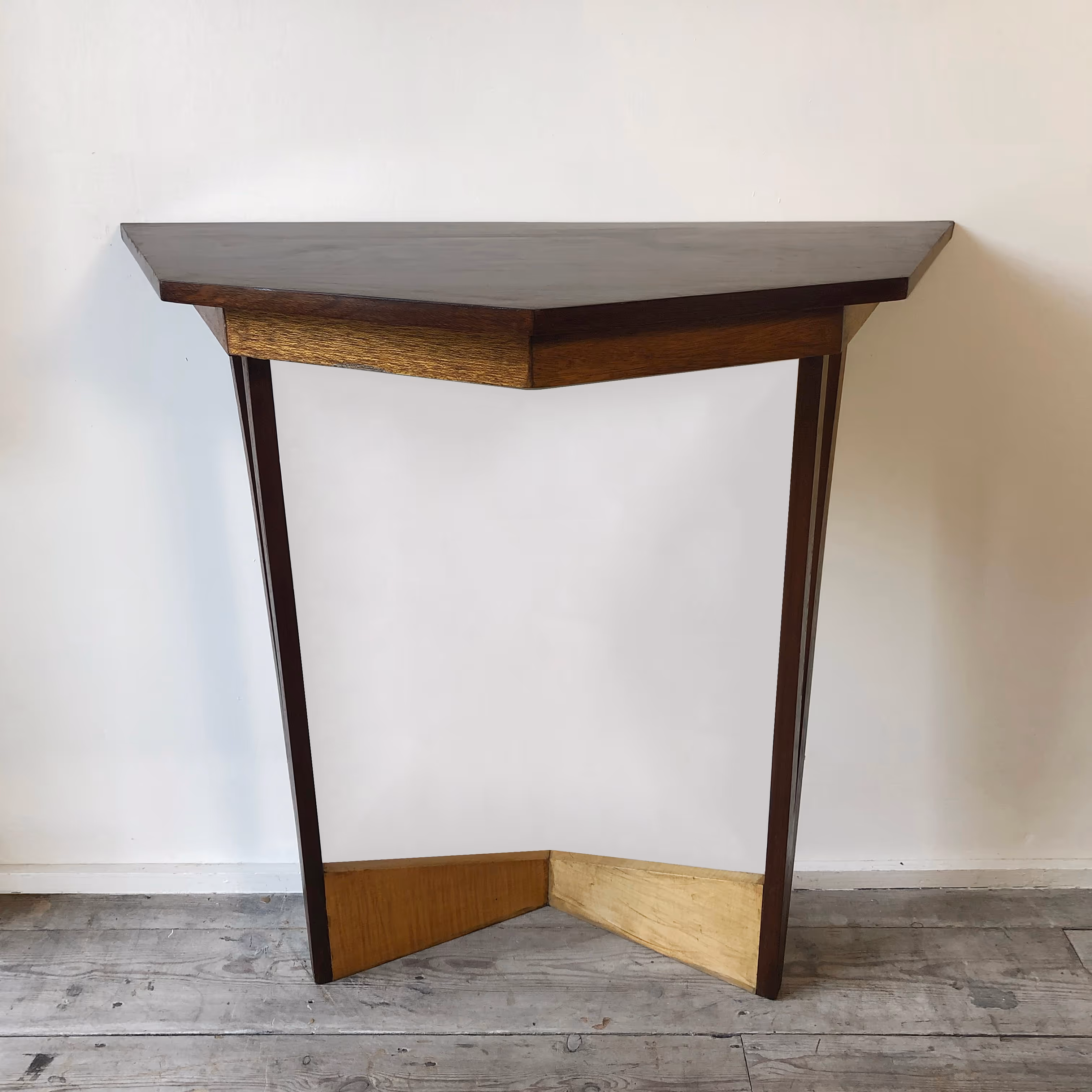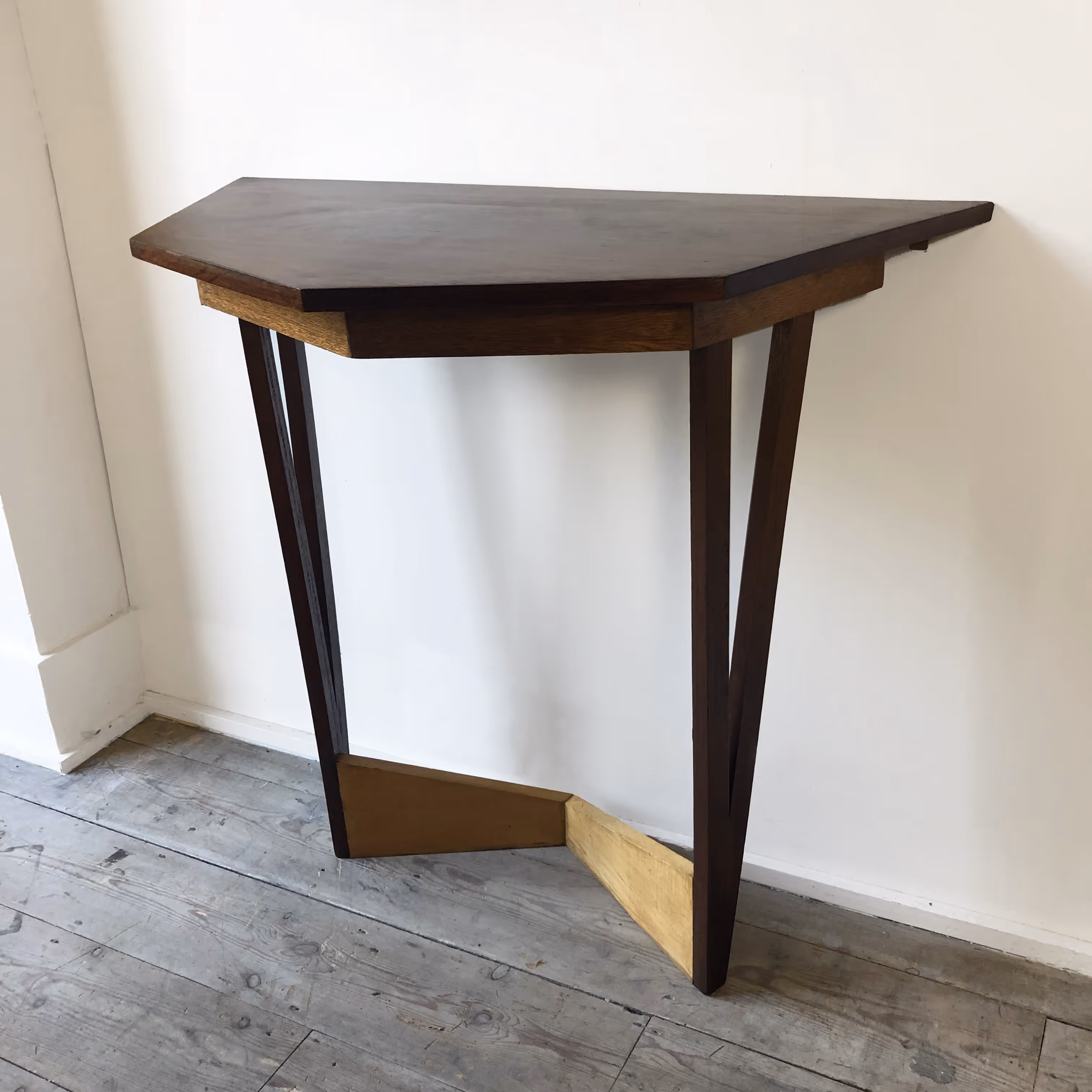 Semi octagonal console table with geometric base. Veneered mahogany & beech.