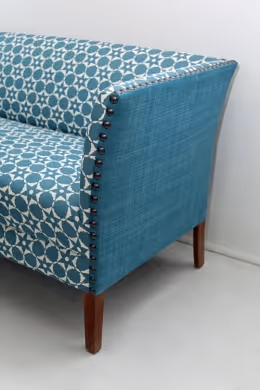 A small sofa recently recovered in a blue patterned fabric, with contrasting plain blue fabirc at the back and large studs