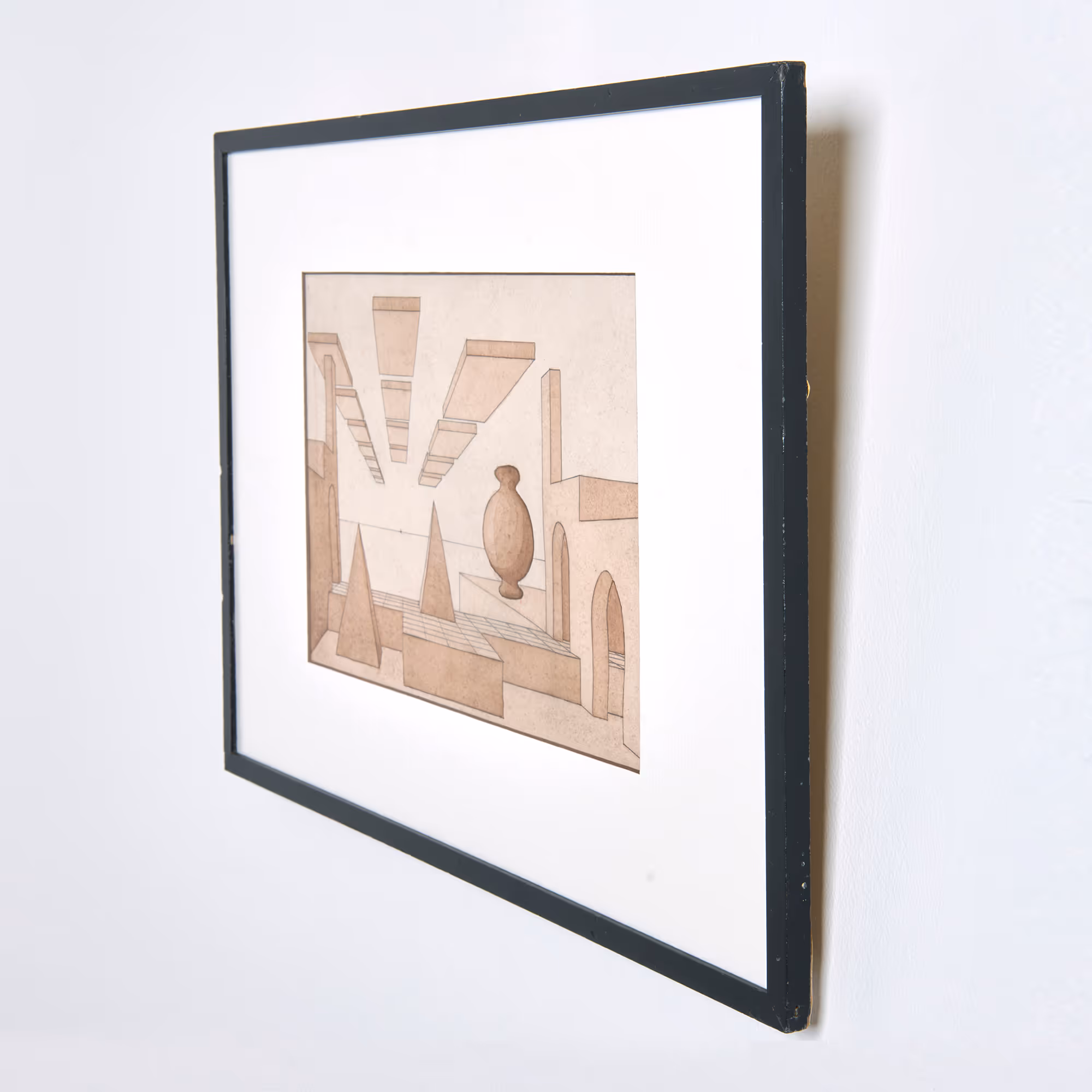 Surrealist, architectural inkwash drawing. Signed RG Worthington.