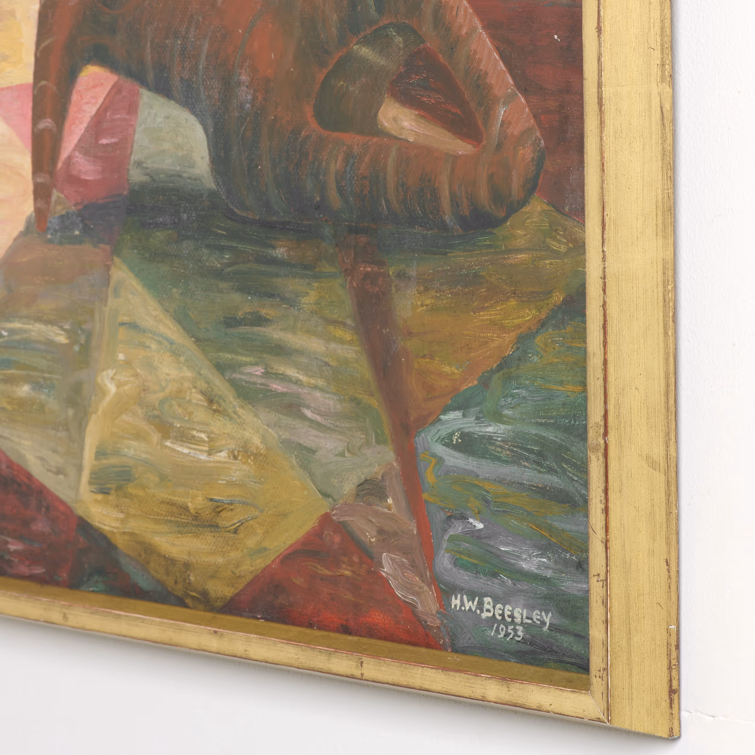 Surreliast painting signed HW Beesley and dated 1953. Oil on masonite. Nothing can be found on this artist, and yet this painting clearly references the works of Henry Moore (standing figures) and Ben Nicholson (abstract composition in top right section), at the time when these artists had recently shot to fame. The hand is assured and the colour palette vibrant.