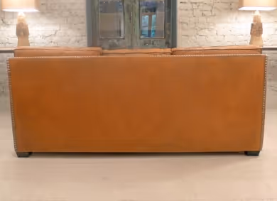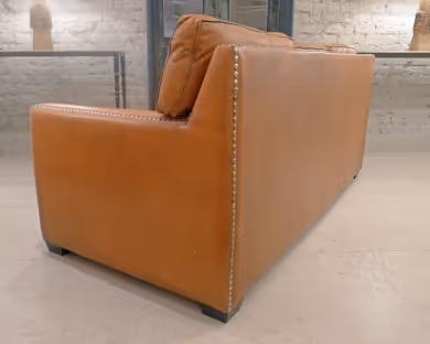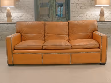 A three-seater sofa in studded tan leather, on square legs. Clean, square lines.