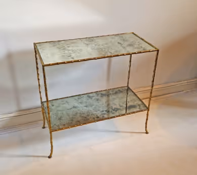 A tiered brass faux bamboo side table in the manner of Maison Baguès. The damaged original tops were recently replaced with distressed mirror glass.